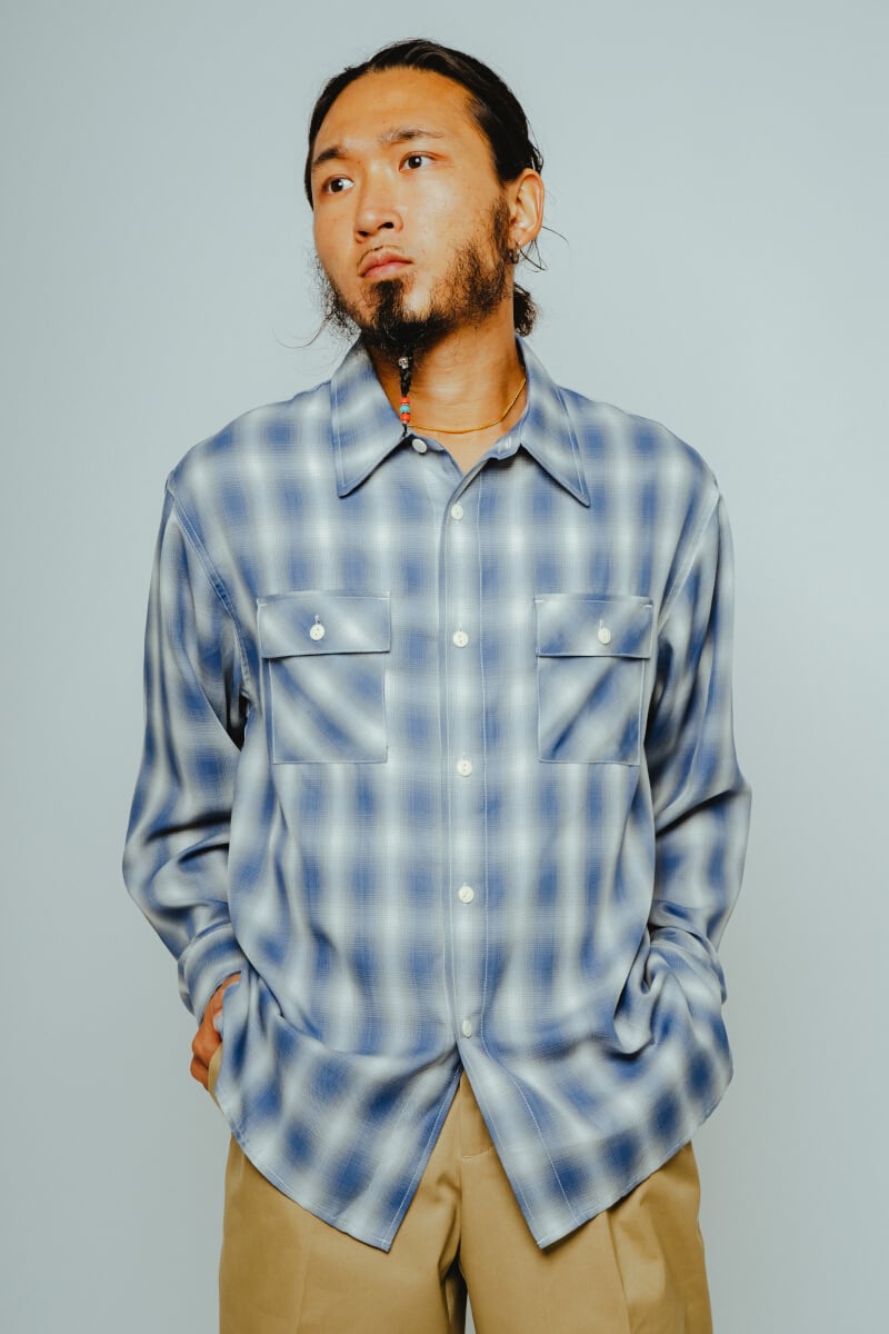 素材にはレーヨン混生地を使用。滑らかな肌触りと上品な落ち感を活かしつつ、オンブレチェックのパターンや色味は現代のスタイルに合わせてアップデートしました。BIGMIKEが得意とするヴィンテージワークシャツのエッセンスをベースに、今の気分で着られるフィットと仕様へと再構築。