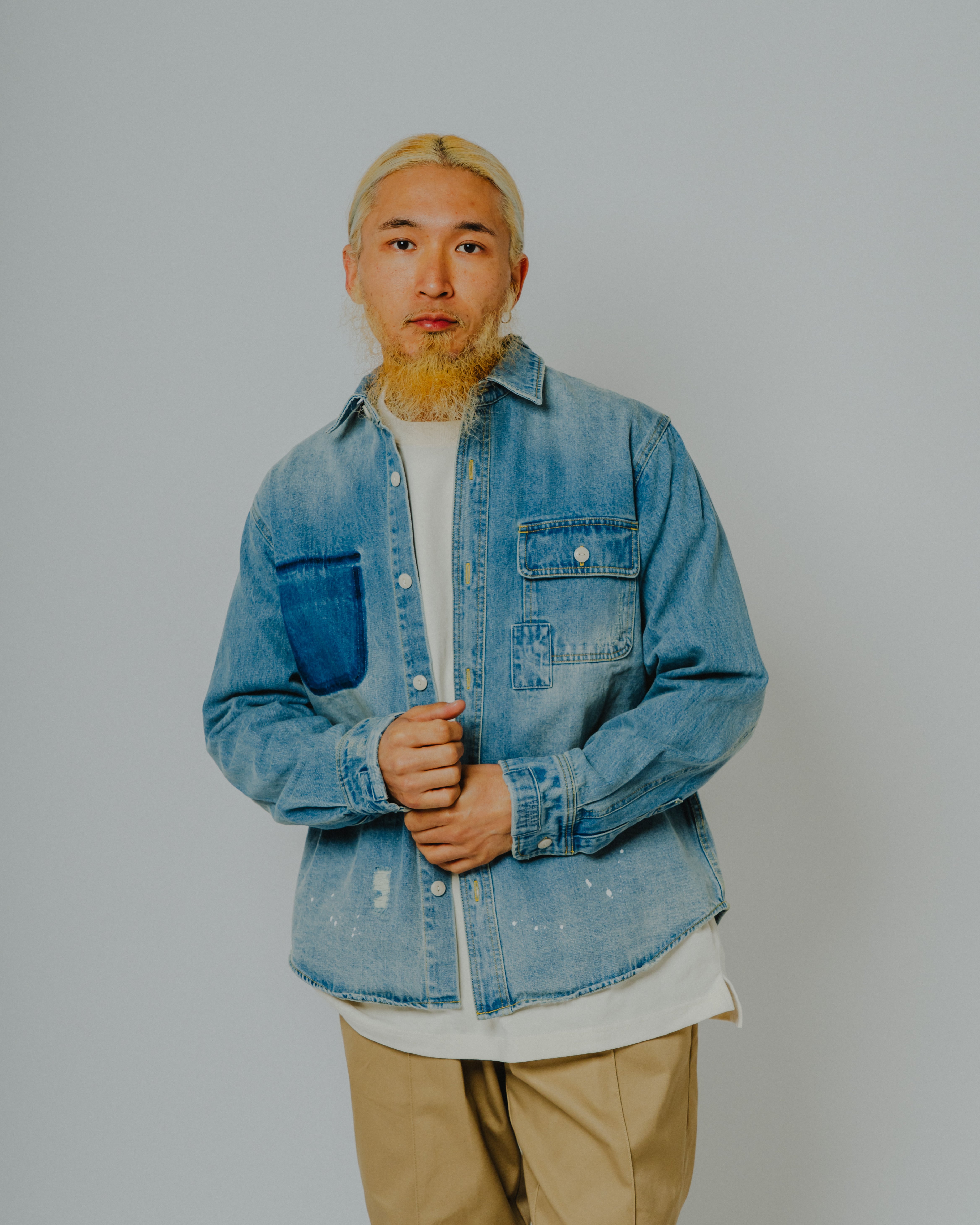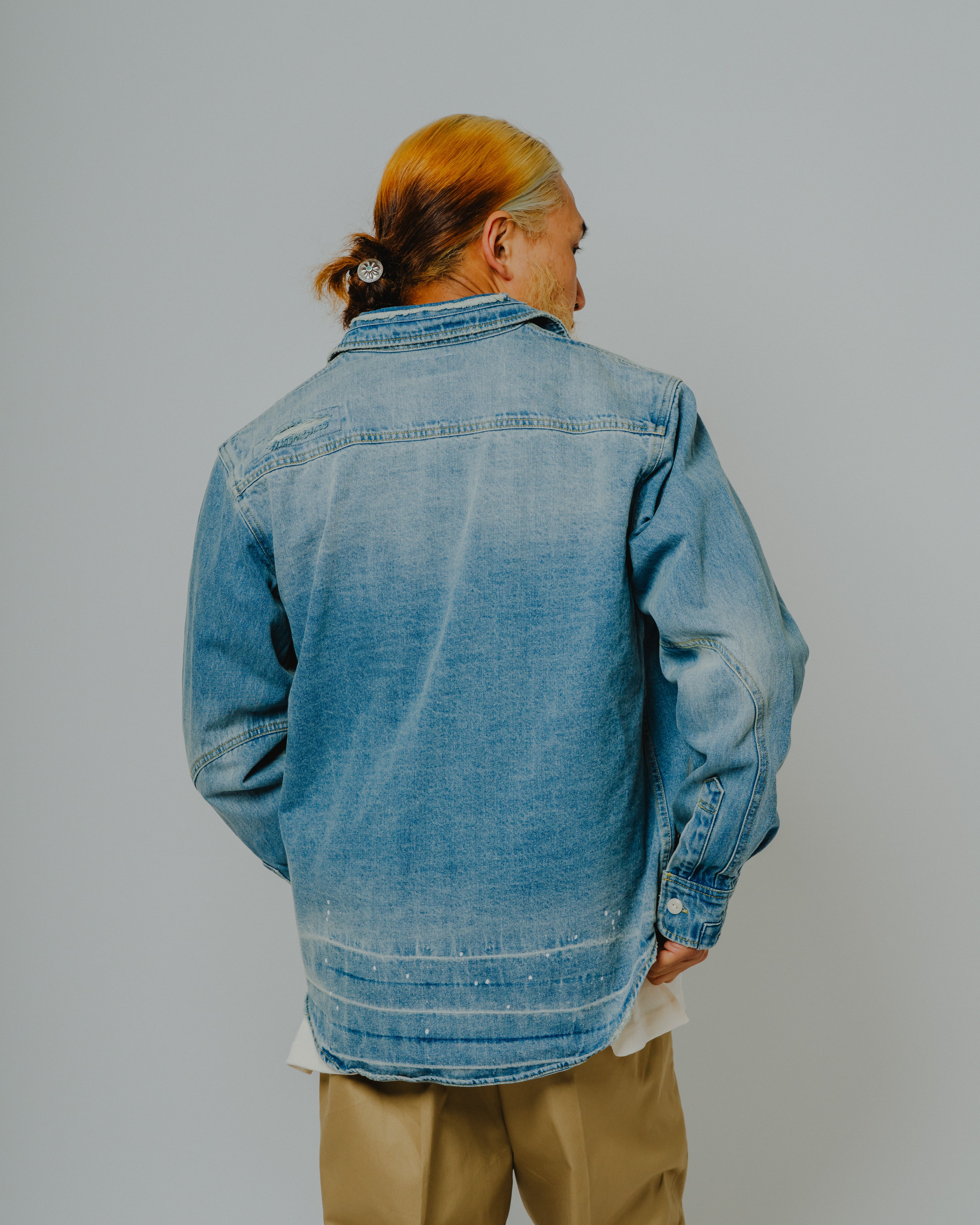 強めのウォッシュ加工とダメージを加えることで、ヴィンテージライクな風合いとリメイク感を演出したロングスリーブのデニムシャツ。一点一点異なる表情を持ち、まるで古着を自分らしく着こなしているような、ユニークなスタイルが楽しめます。