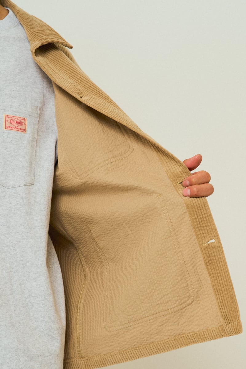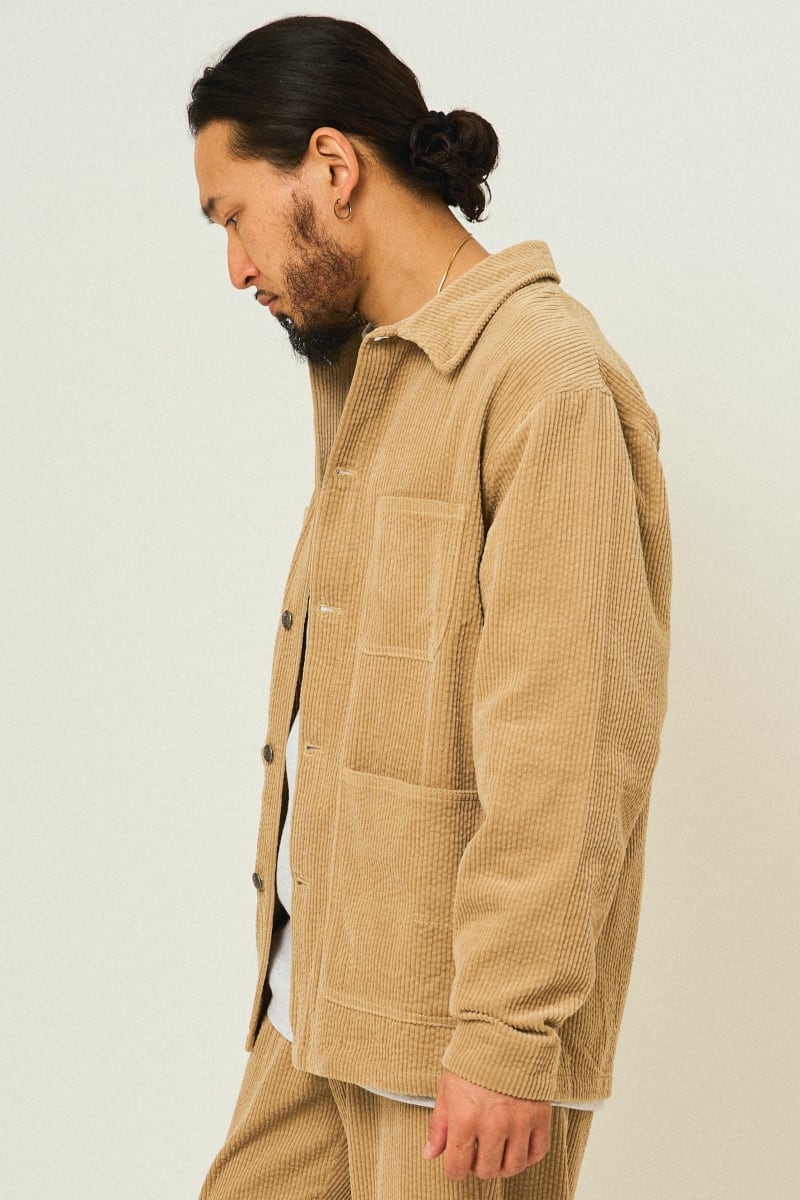 古き良きワークウェアを、現代の暮らしに馴染むよう仕立て直した一着。6ウェルの太畝コーデュロイに洗いをかけ、手にした瞬間からやわらかく、まるでスウェットのような着心地に仕上げました。
