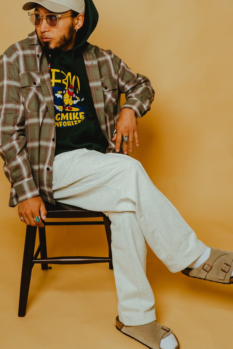 同素材の「サングラス 3ポケット クルーネックスウェット」と合わせたセットアップ着用も可能。上下で揃えることで、ラフすぎない大人のカジュアルスタイルが完成します。