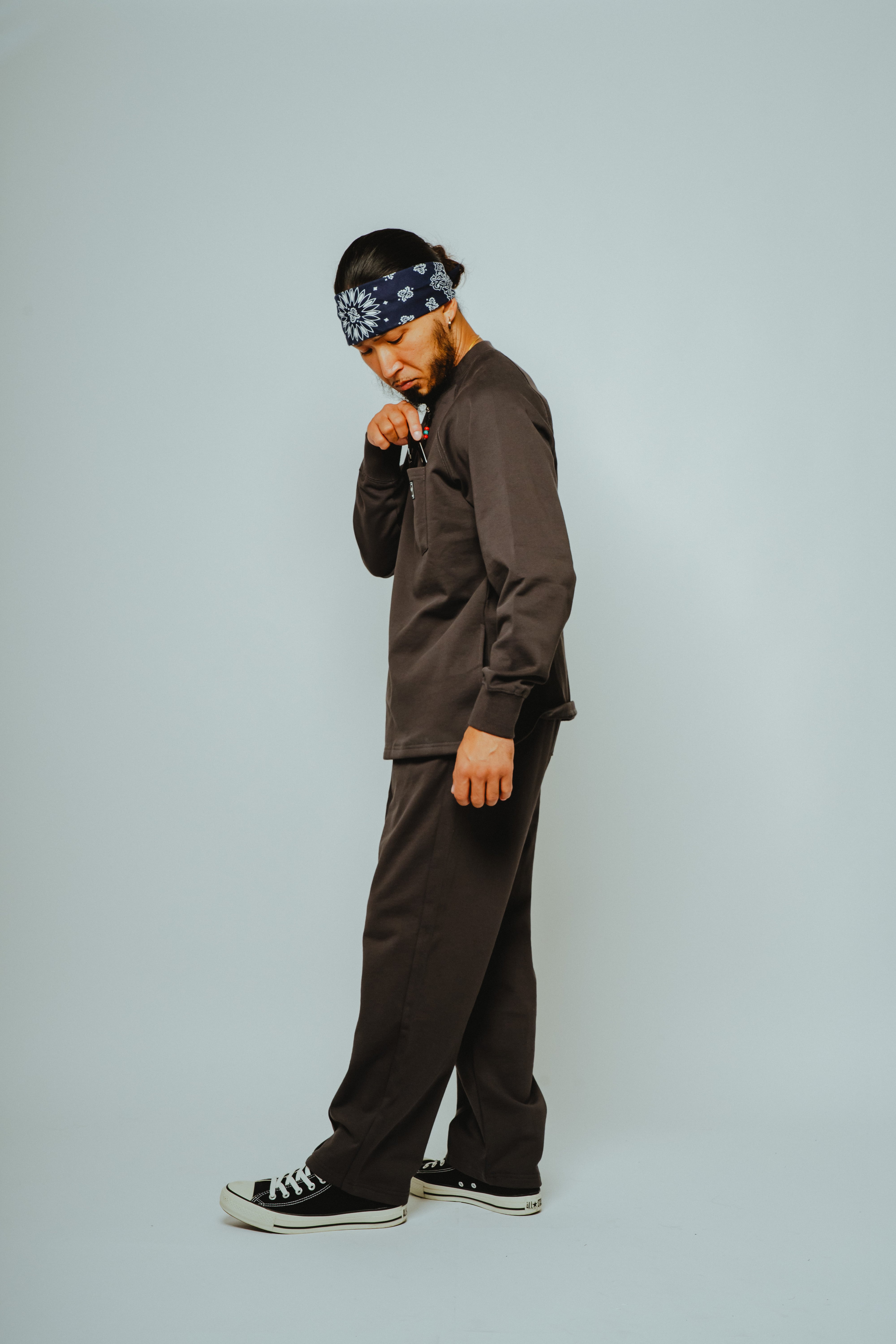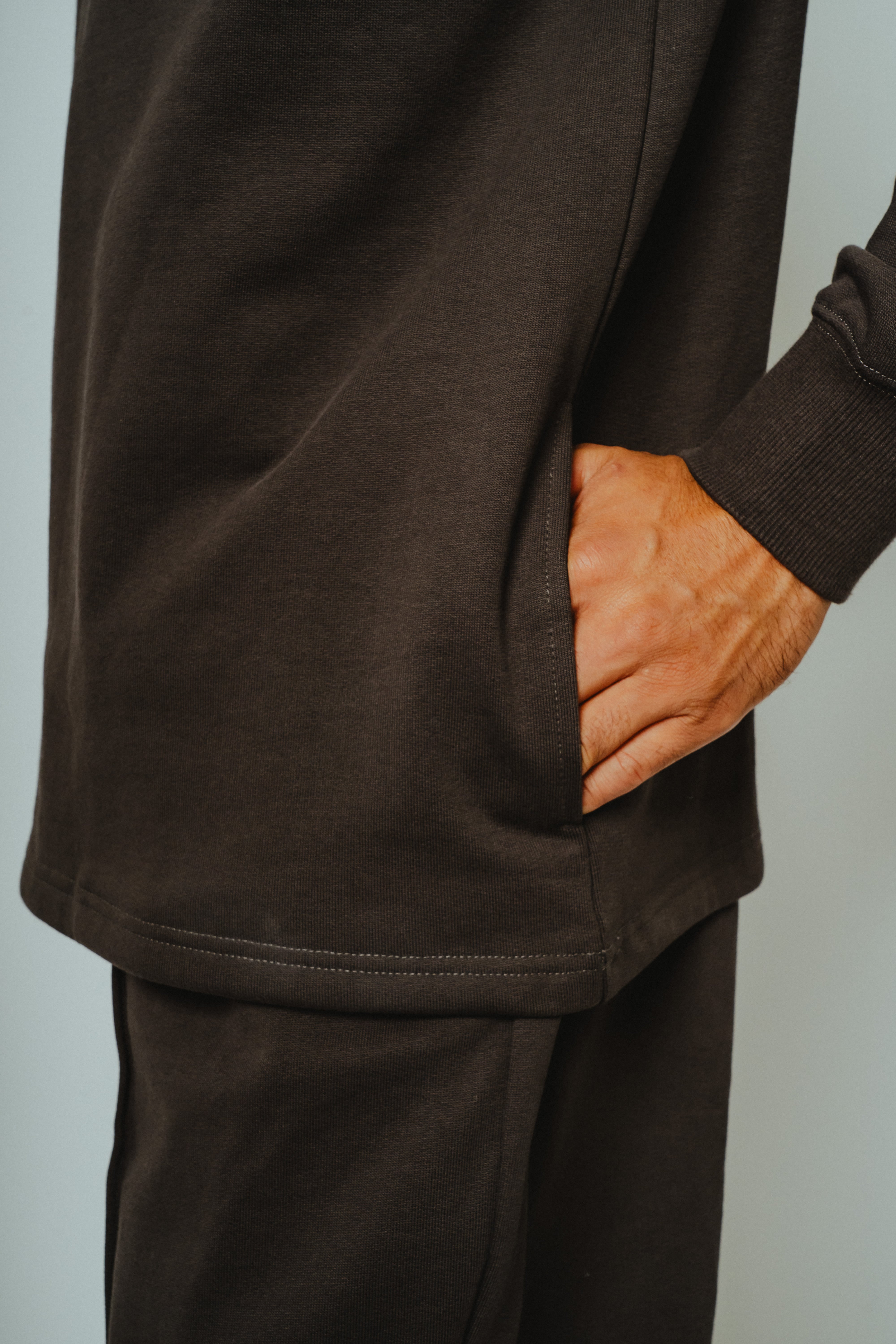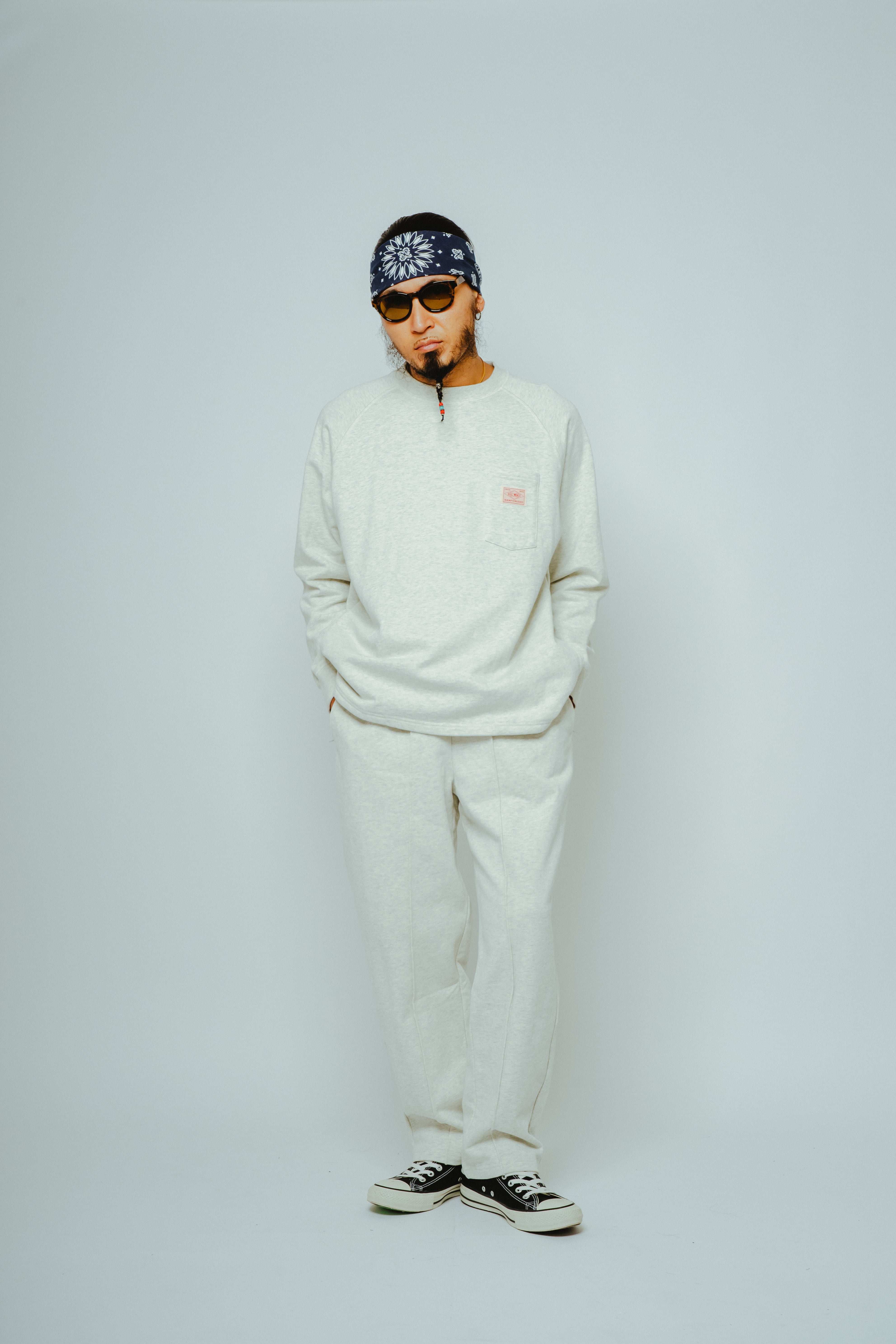胸元にはサングラスや小物を収納できるポケットを配置。さらに両サイドにはハンドポケットを備え、スウェットでありながら軽いアウター感覚でも使える実用性をプラスしています。