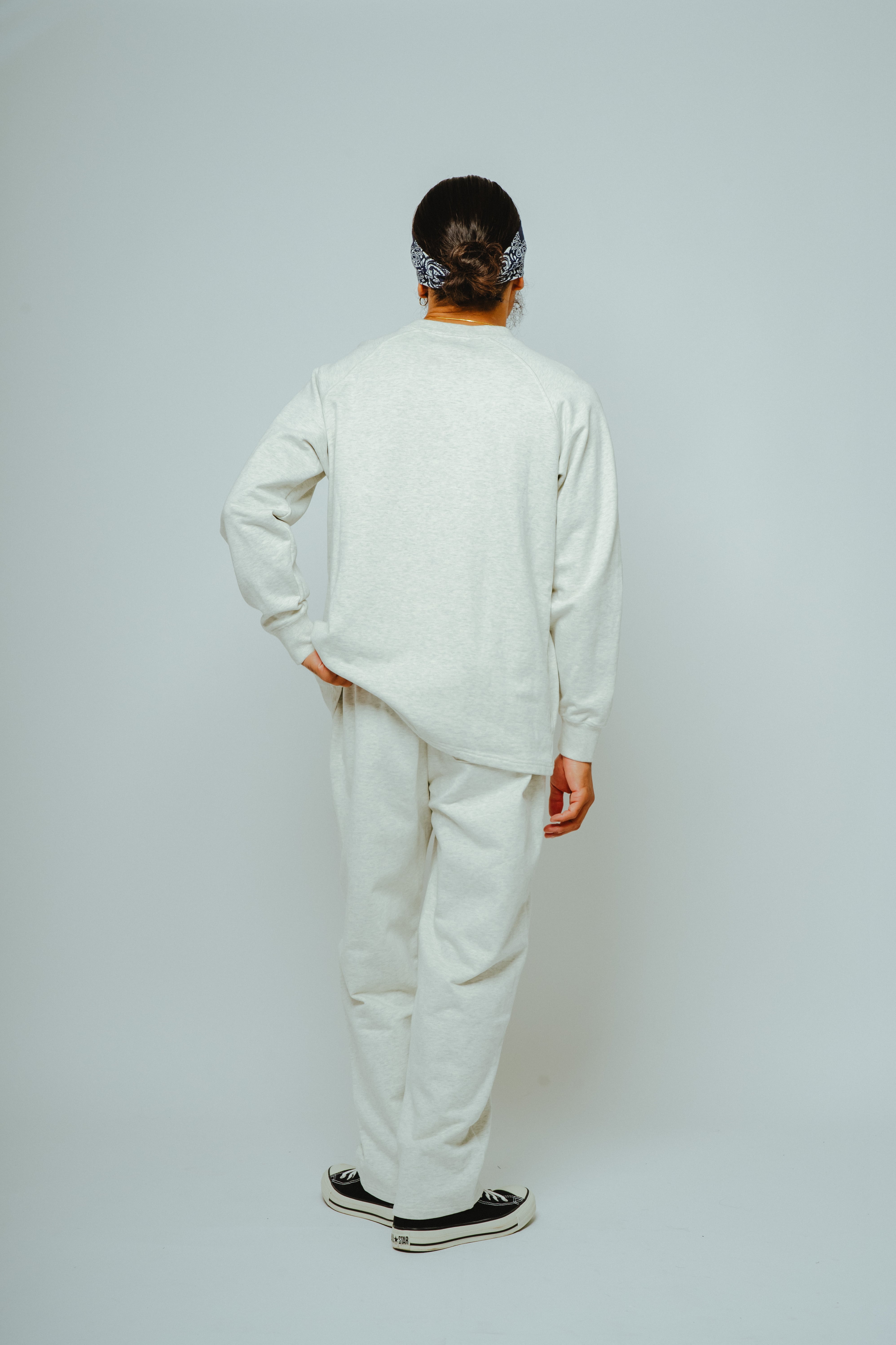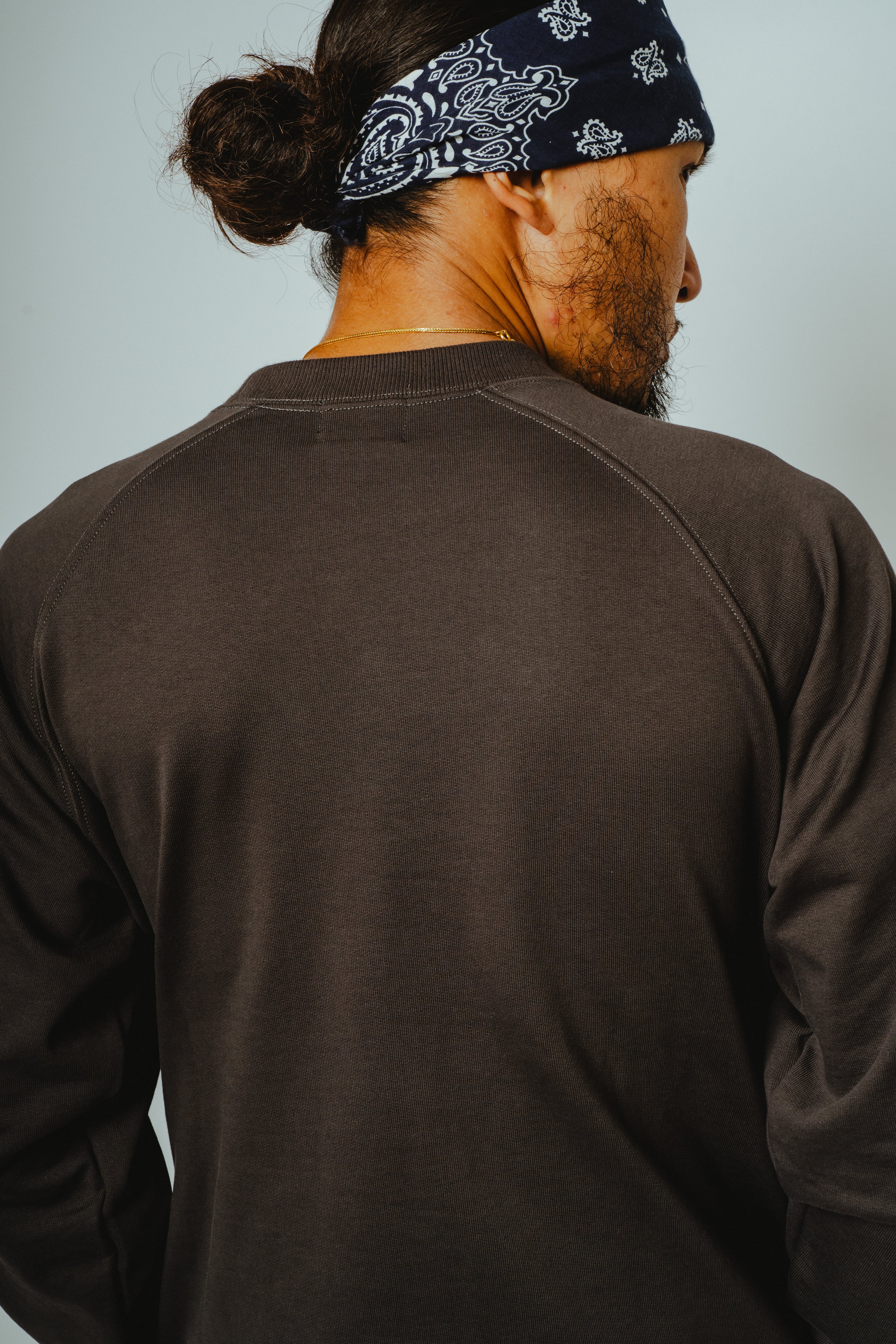 浅めに設定したクルーネックは首元をすっきり見せ、インナー使いもしやすいバランス。ラグランスリーブ仕様により、肩周りの可動域を確保し、リラックスした着心地を実現しています。