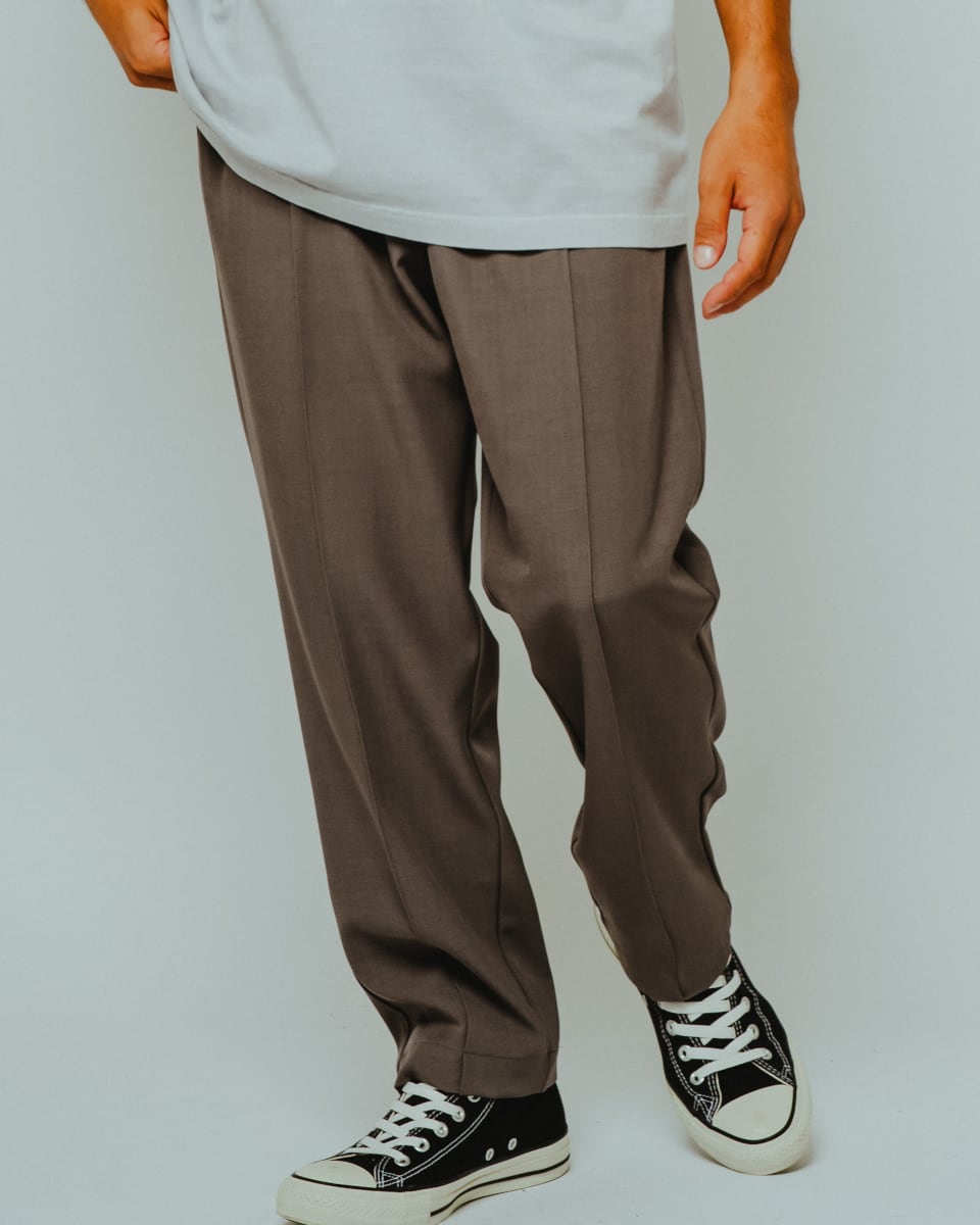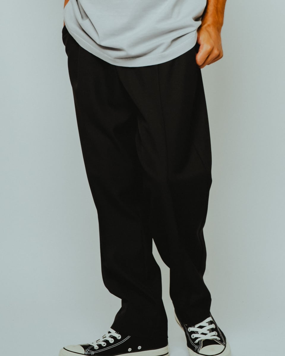 フロントに施したピンタックが縦のラインを強調し、脚をすっきりと見せる設計。イージーパンツでありながら、スラックスのような端正な印象を与え、カジュアルからフォーマル寄りの着こなしまで幅広く活躍します。