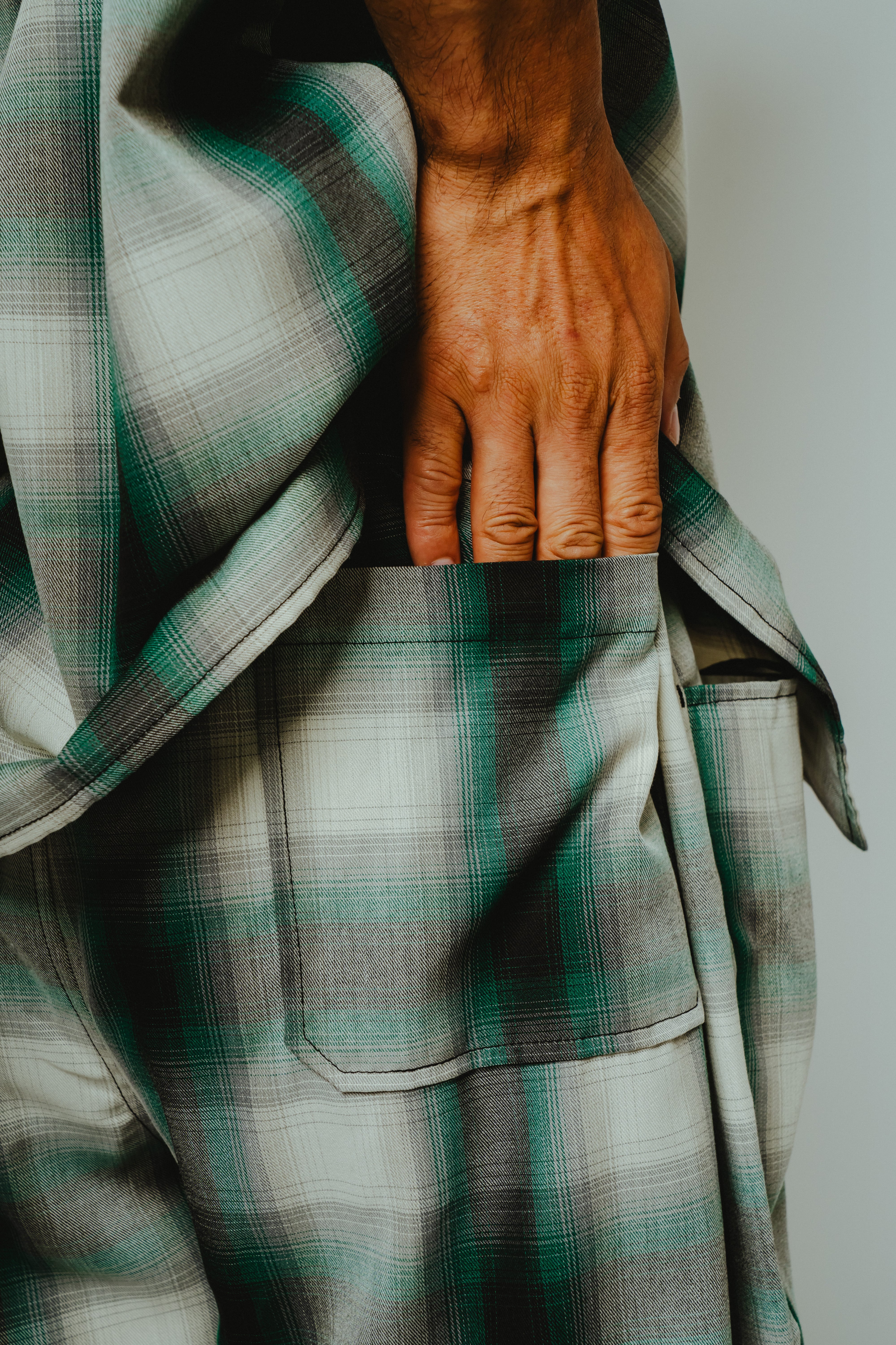 境界線がぼやけた陰影のあるチェック柄と、レーヨン特有のクタッとした風合いが好相性。新品でありながら、穿き込んだような深みのある表情を楽しめます。