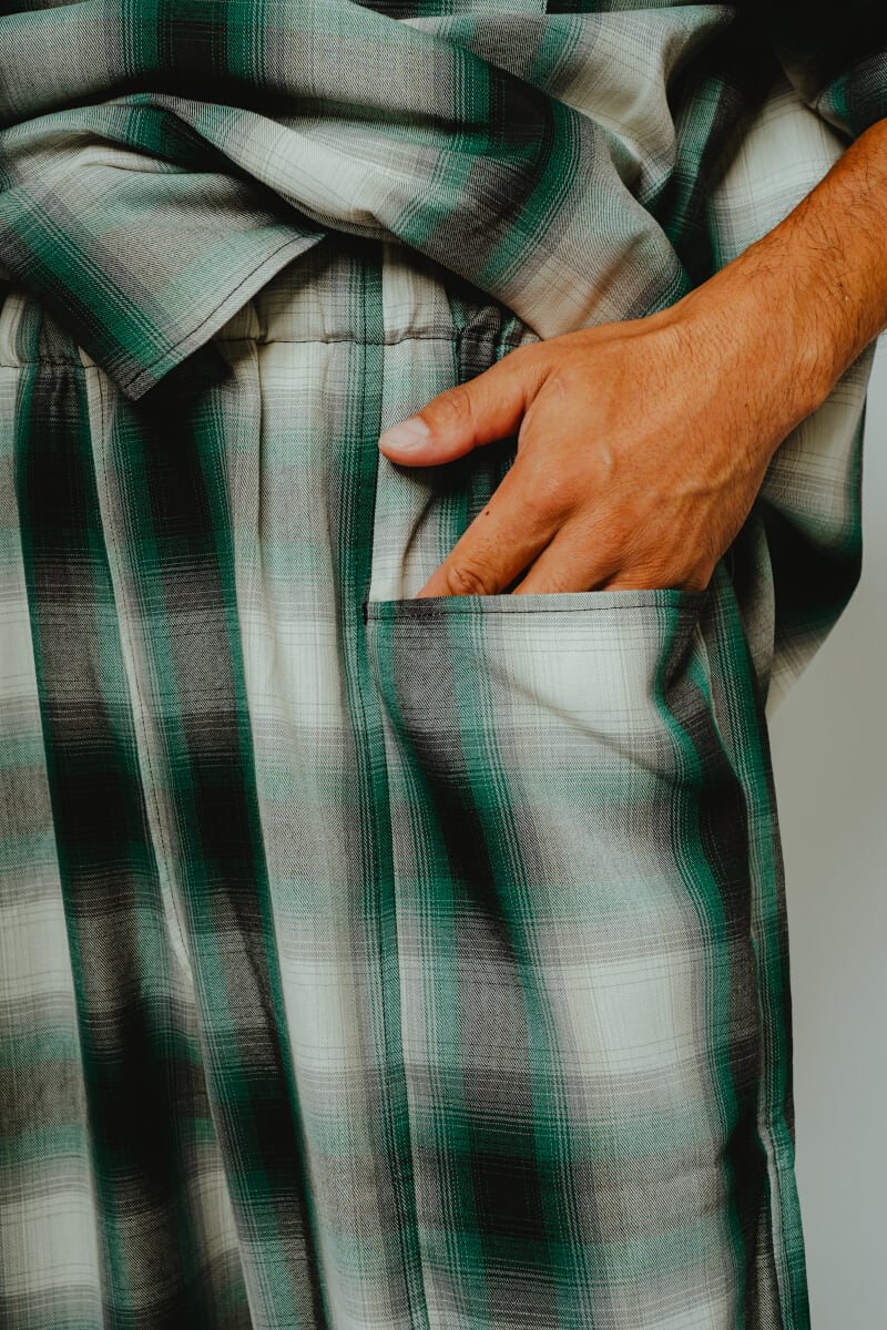 アメカジの王道であり、ワークブランドとの相性の良いオンブレチェックを、極上のリラックスパンツへ落とし込みました。レーヨン混素材ならではのとろみのある質感と美しいドレープが、歩くたびに自然な揺れを生み、コットン素材では表現できない大人の余裕を演出します。