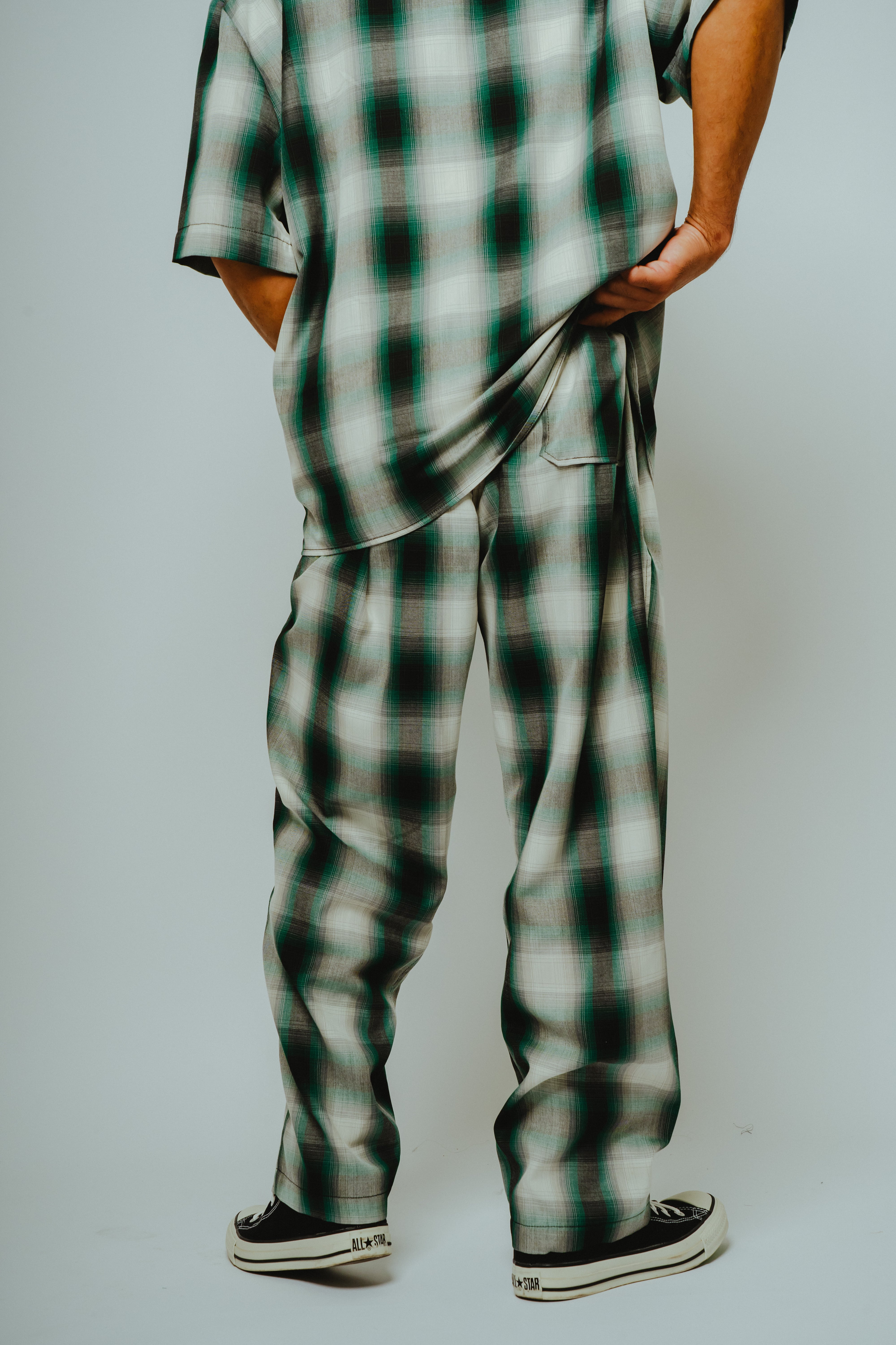 同素材のオンブレチェックシャツ(別売り)と合わせれば、力の抜けた色気あるセットアップが完成。ラフにも、大人っぽくも着こなせます。