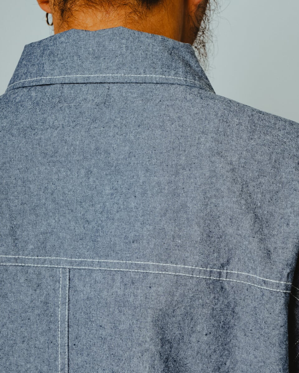 タテ糸に色糸、ヨコ糸に白糸を用いたシャンブレー生地特有の霜降り調の表情が、デニムのような無骨さと、シャツのような軽やかさを両立。薄手で通気性が良く、驚くほど軽い着心地に仕上げています。