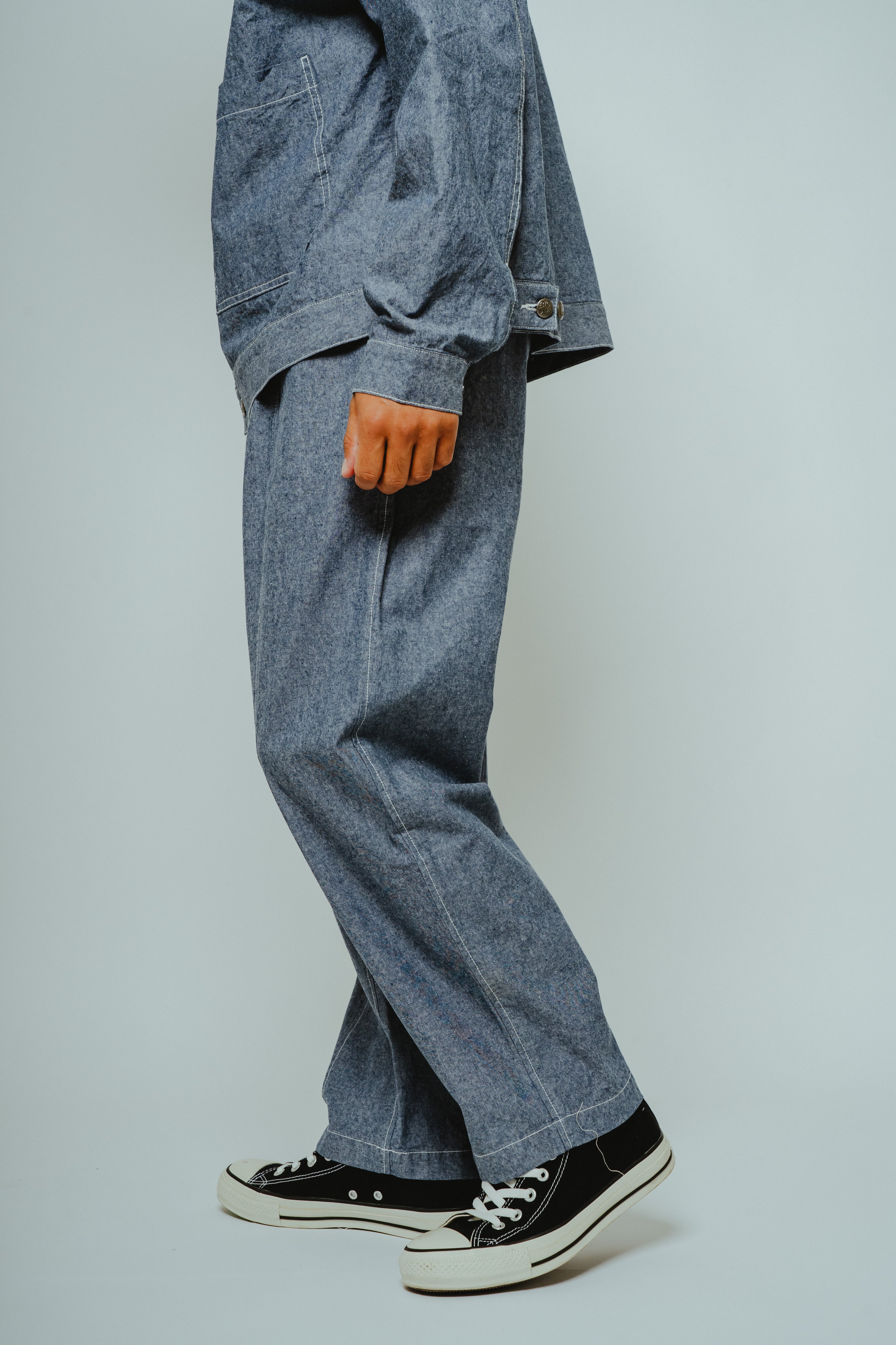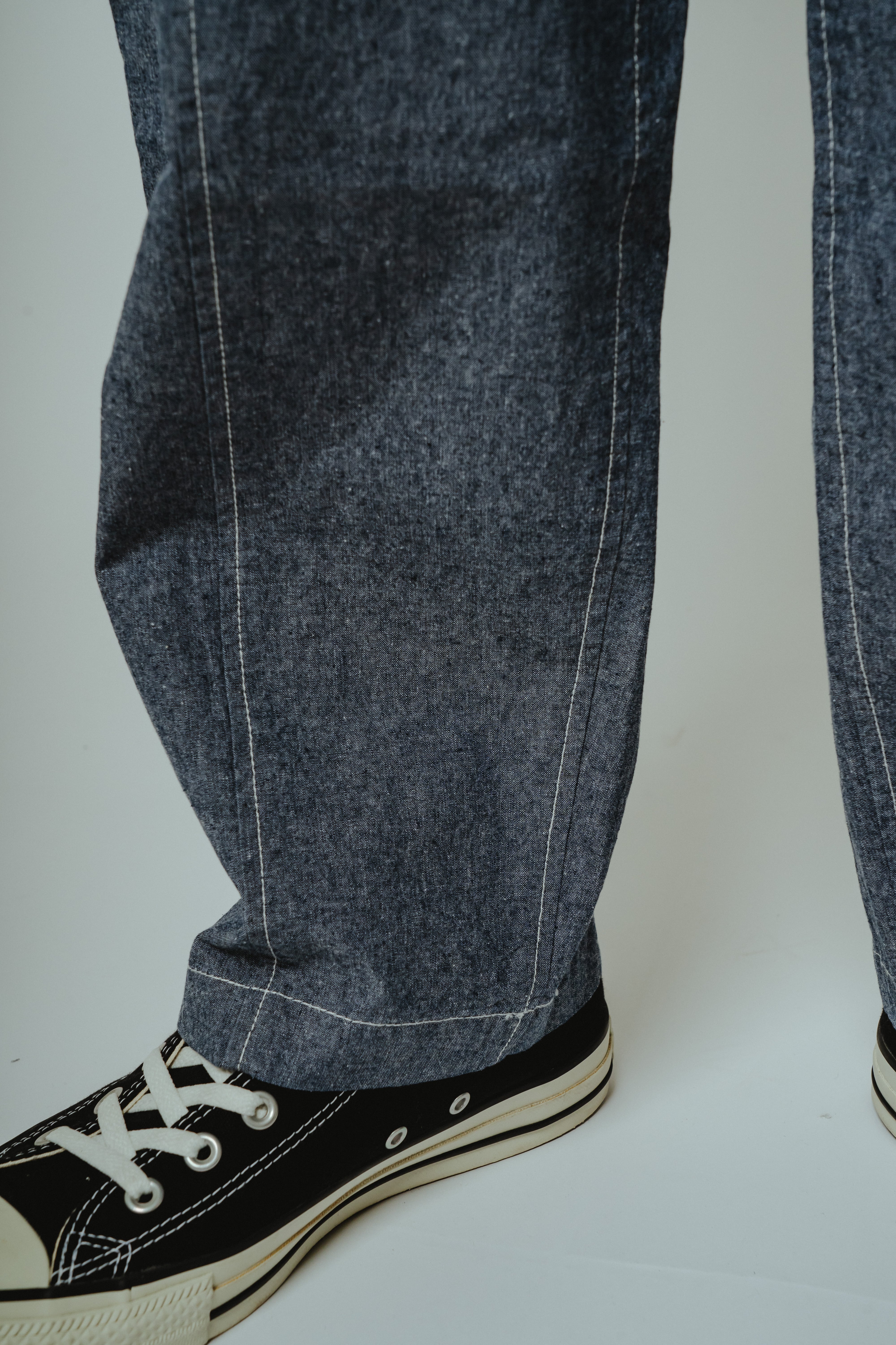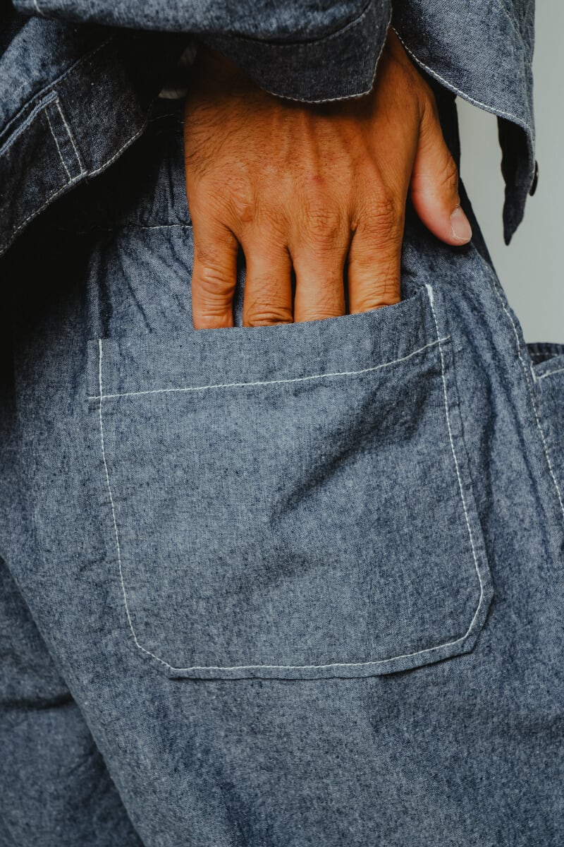 気温が上がる季節、デニムの蒸れや重さが気になる人にこそ穿いてほしい一本。インディゴ染めの糸を使用しながら、平織りで仕上げたシャンブレー生地により、シャツのように軽く、風が抜ける涼感を実現しました。