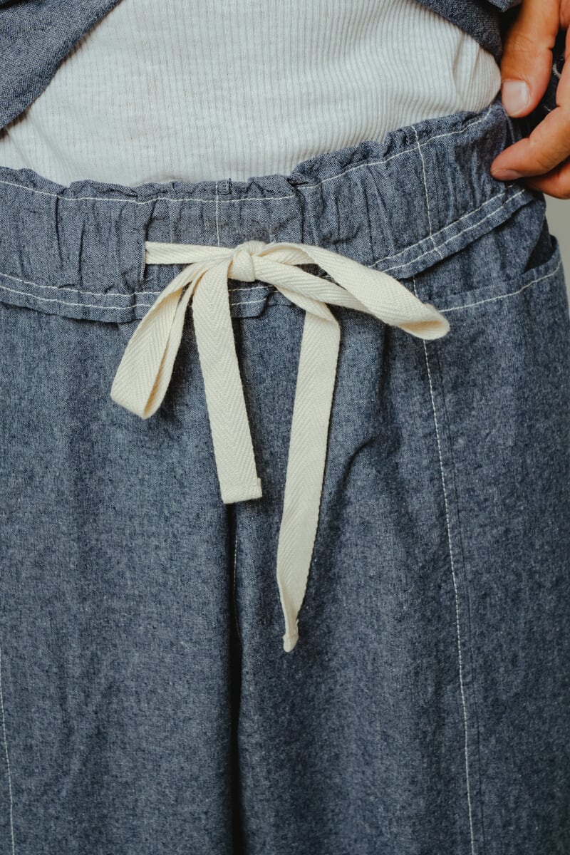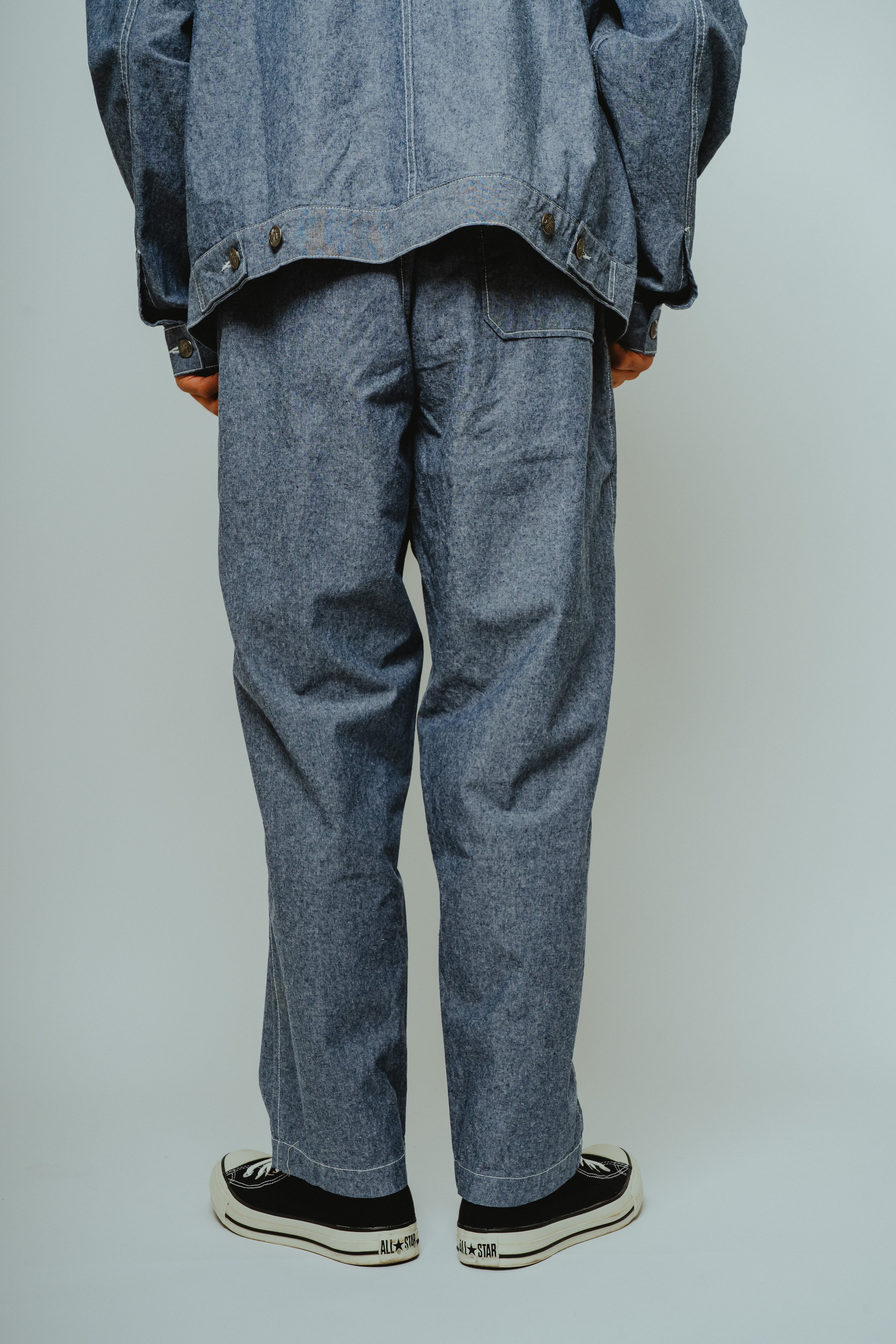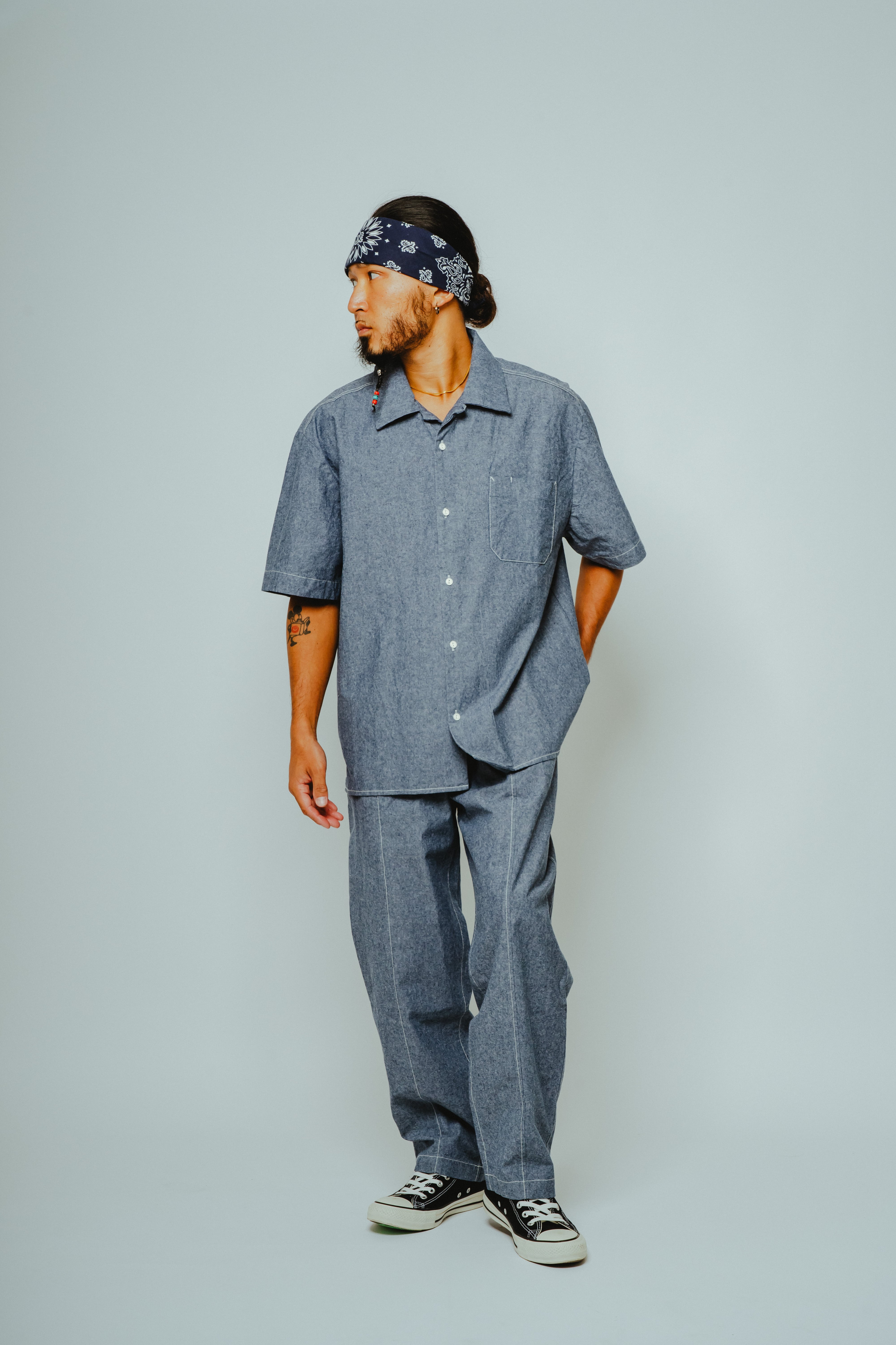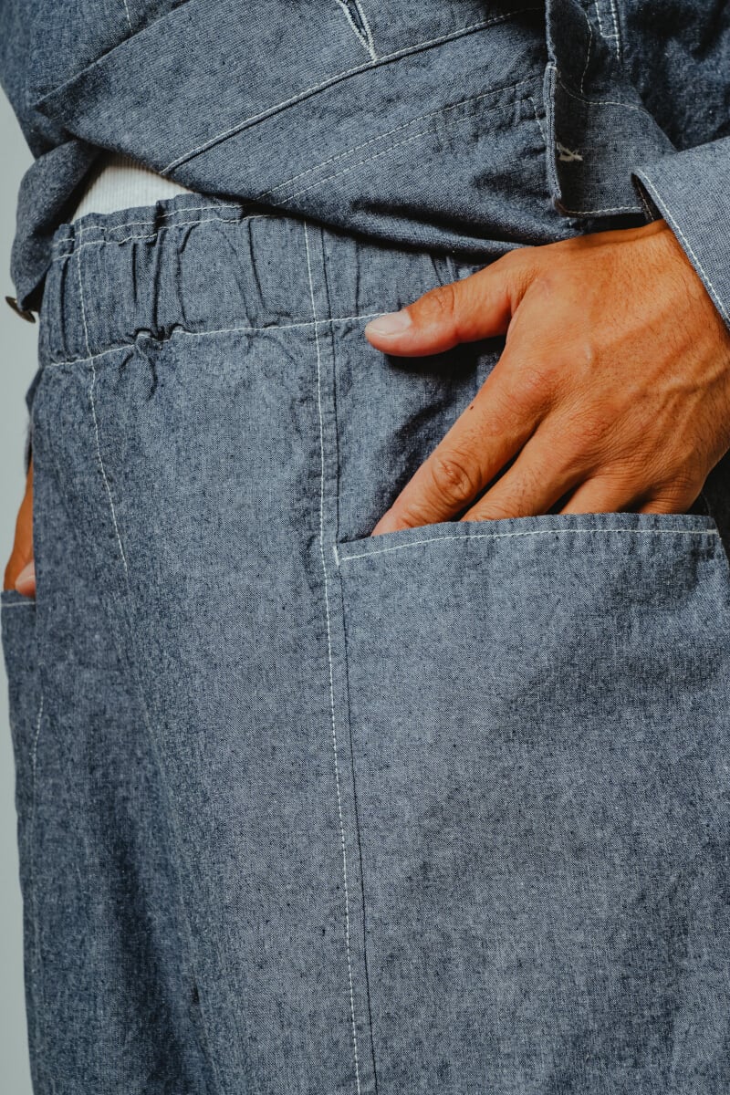 気温が上がる季節、デニムの蒸れや重さが気になる人にこそ穿いてほしい一本。インディゴ染めの糸を使用しながら、平織りで仕上げたシャンブレー生地により、シャツのように軽く、風が抜ける涼感を実現しました。