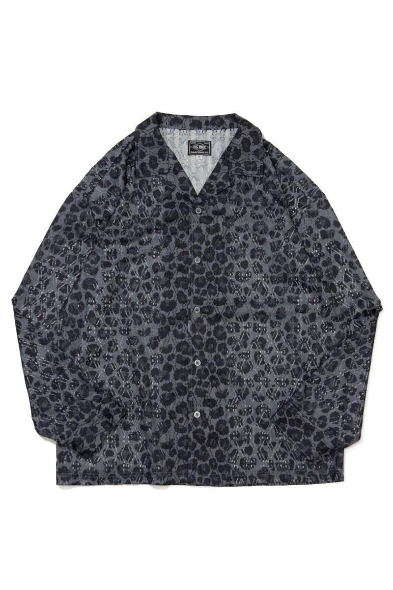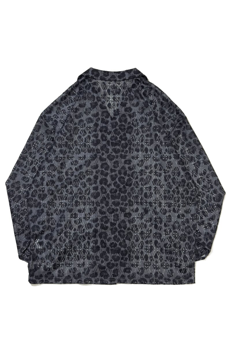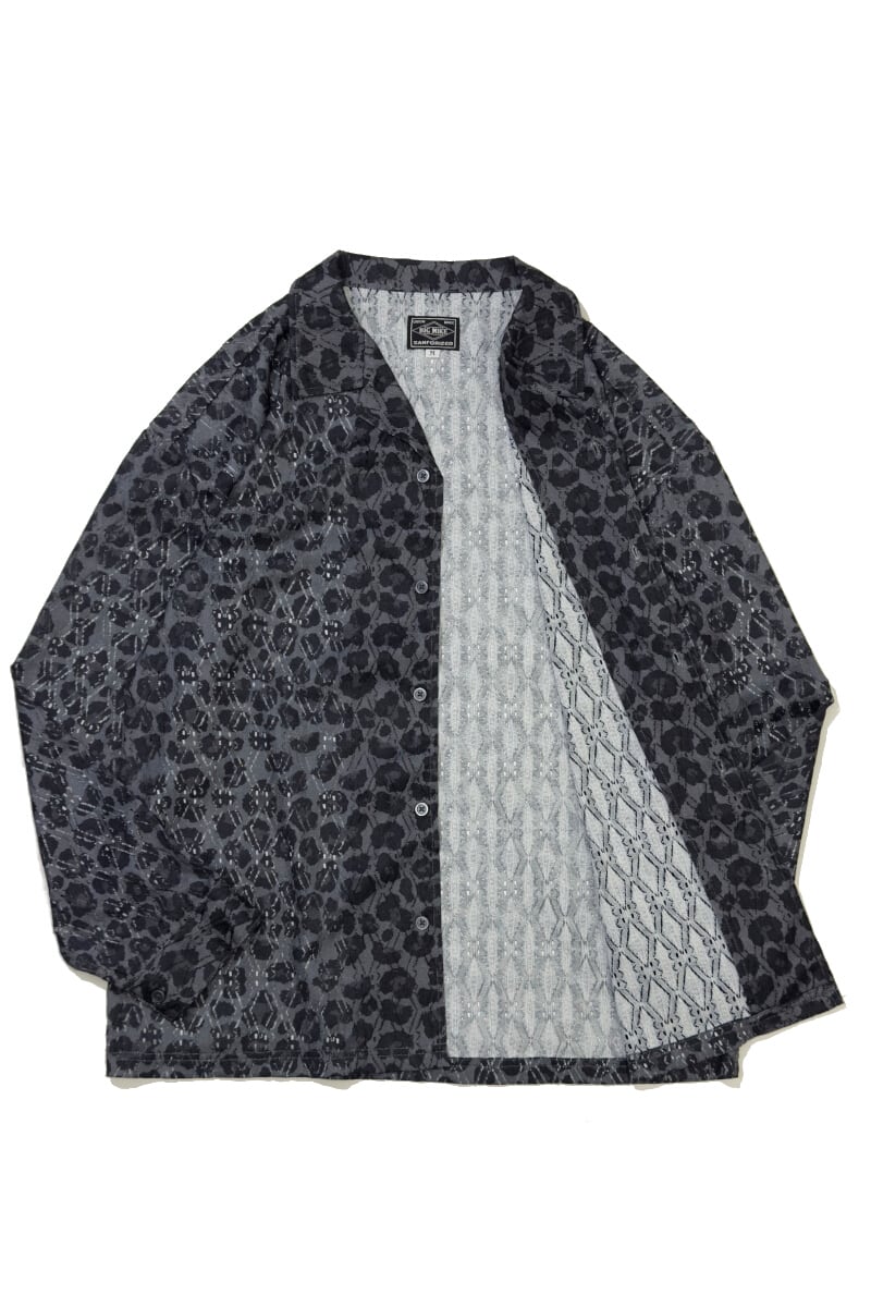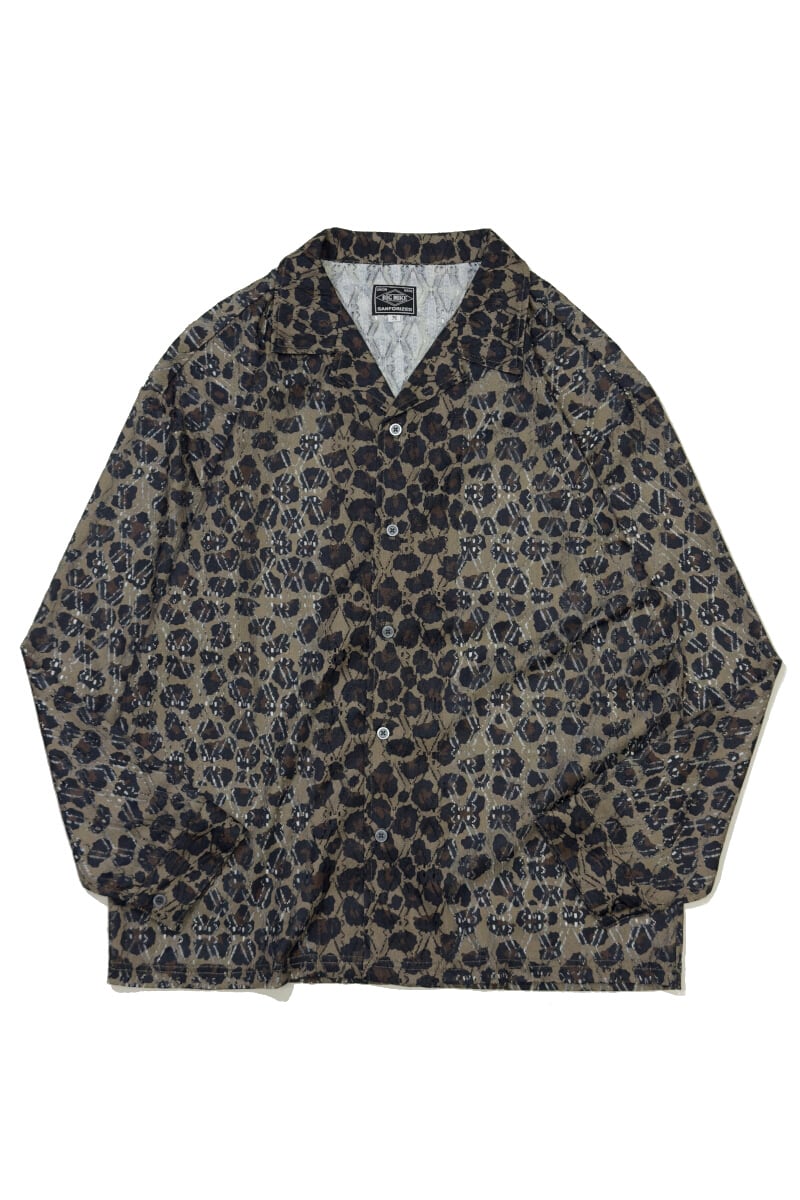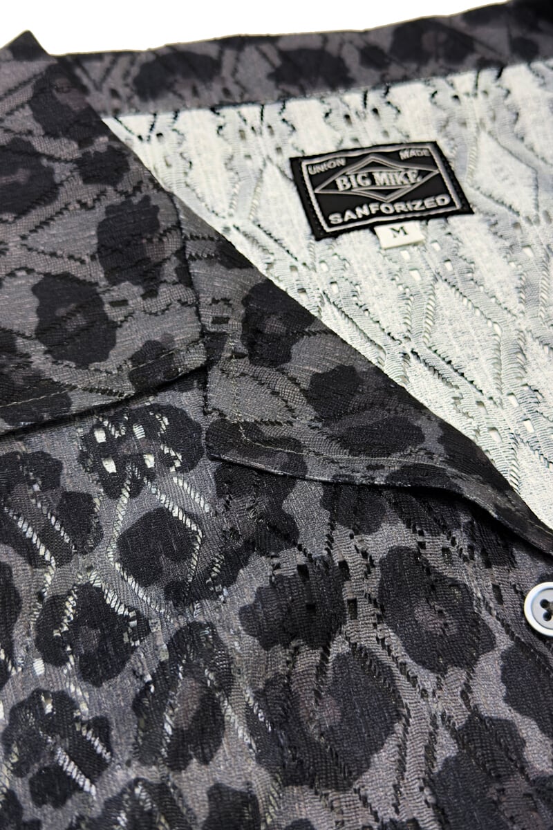 レース生地に豹柄をプリントした、オープンカラー仕様の総柄レースシャツ。透け感のある素材と開放的な首元が重なり、力を抜いて着られる大人の色気を感じさせる一着です。