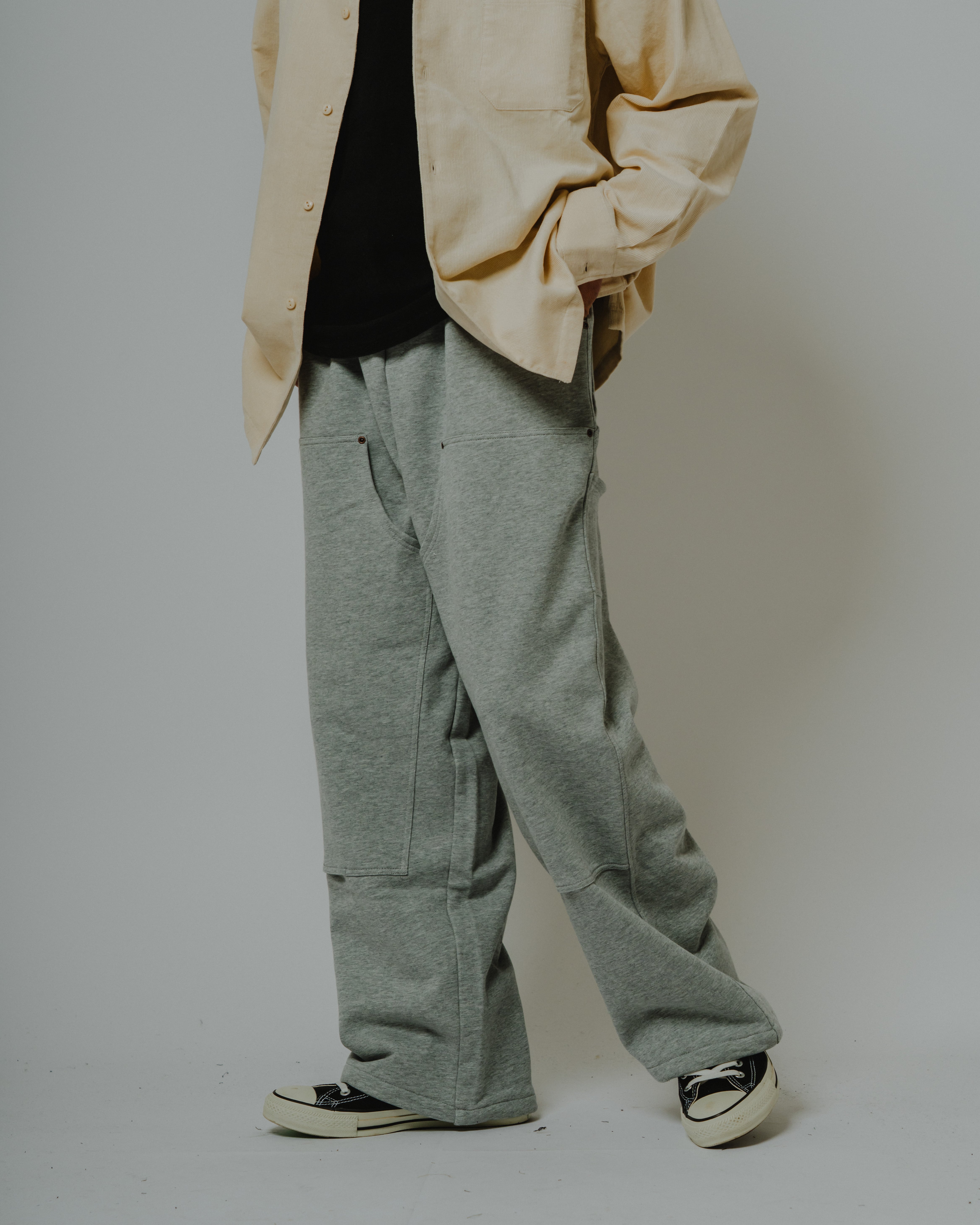 カジュアルウェアの定番であるスウェットパンツを、ワークパンツの文脈で再構築したダブルニースウェットパンツ。ラフな穿き心地はそのままに、無骨なディテールとトレンド感のあるシルエットを掛け合わせた一本です。