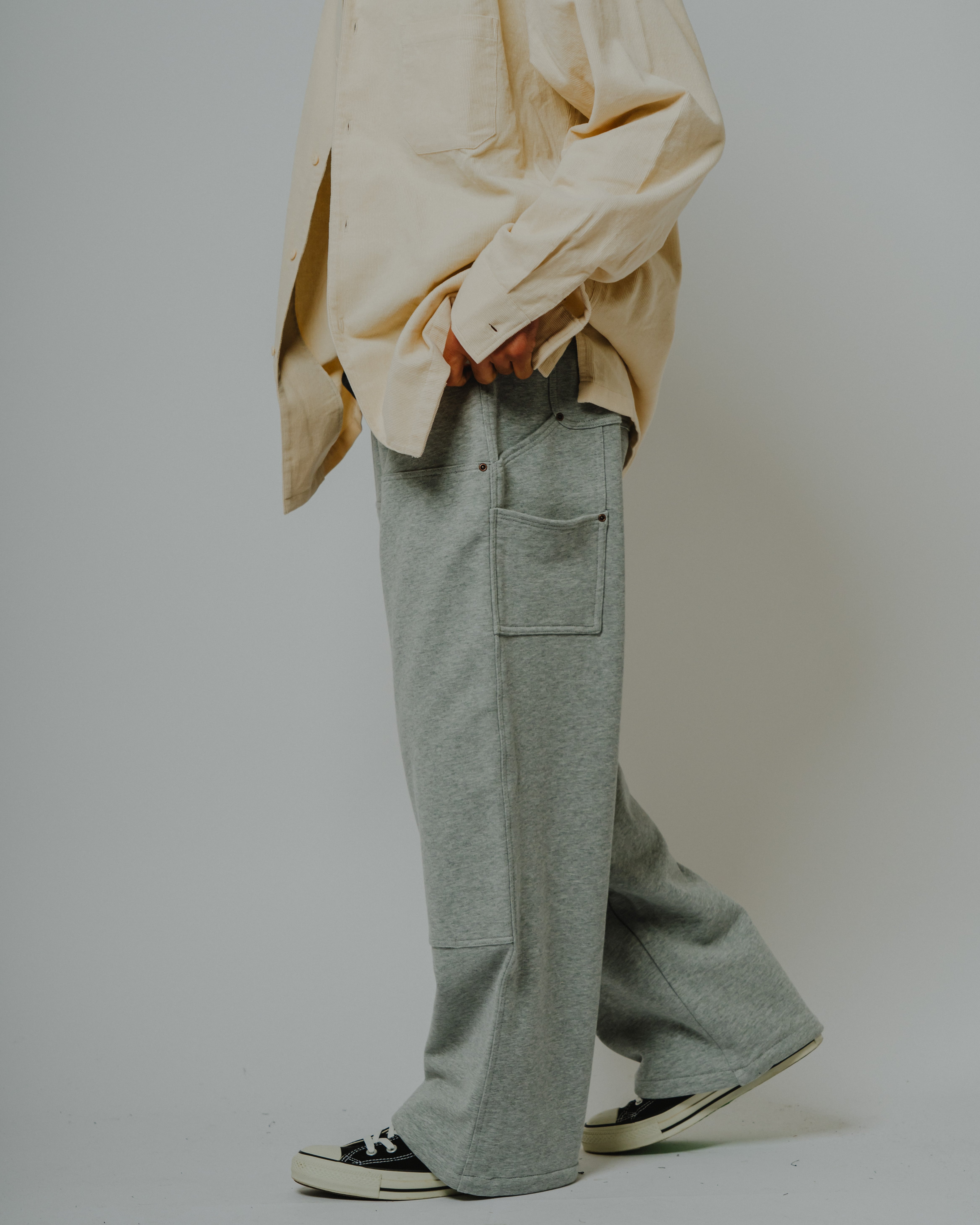 膝をついて作業する労働者のために生まれたダブルニーデザインを、裏毛スウェット素材で表現。本来はタフさを求められる仕様を、あえてスウェットで落とし込むことで、実用性とリラックス感を両立させています。