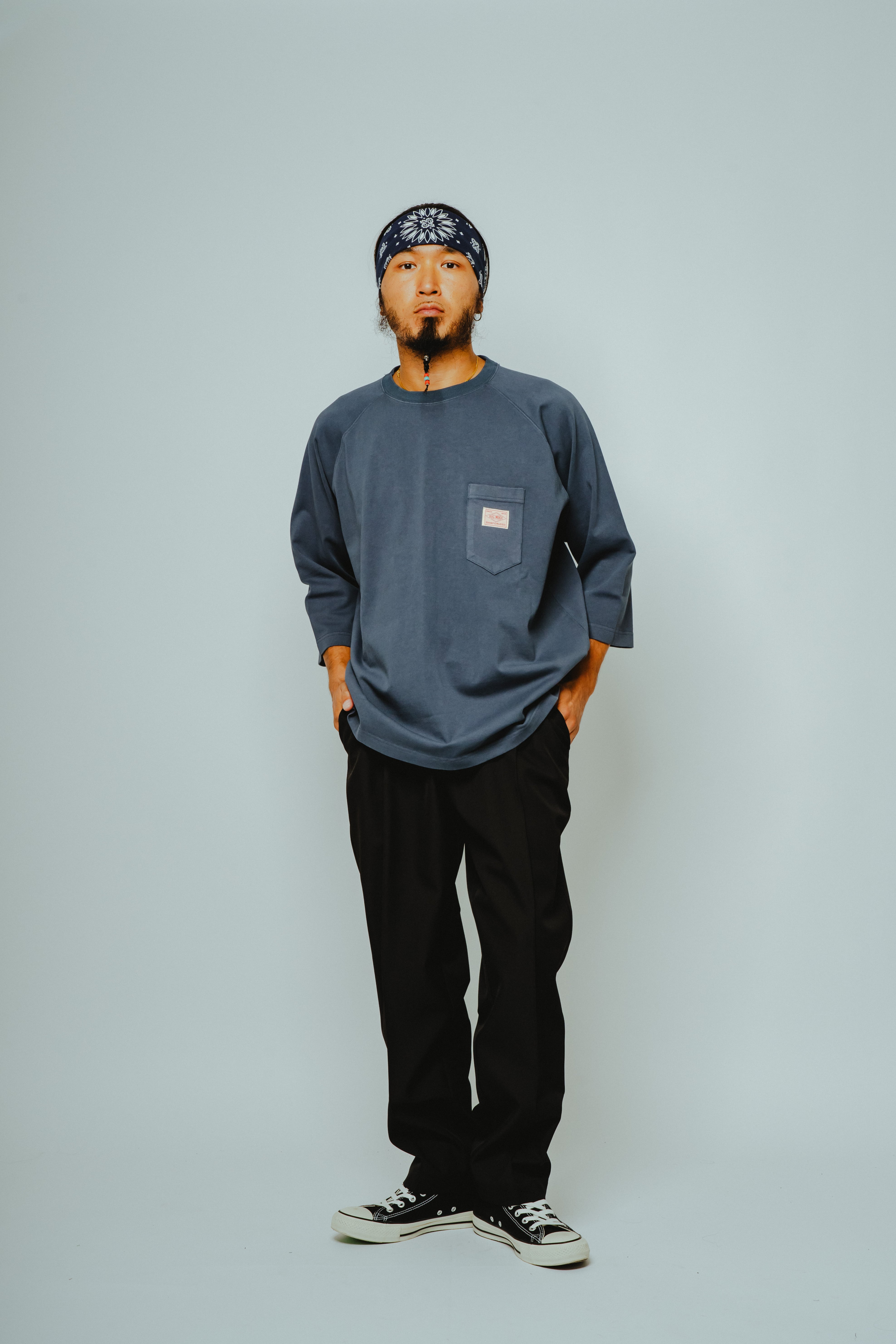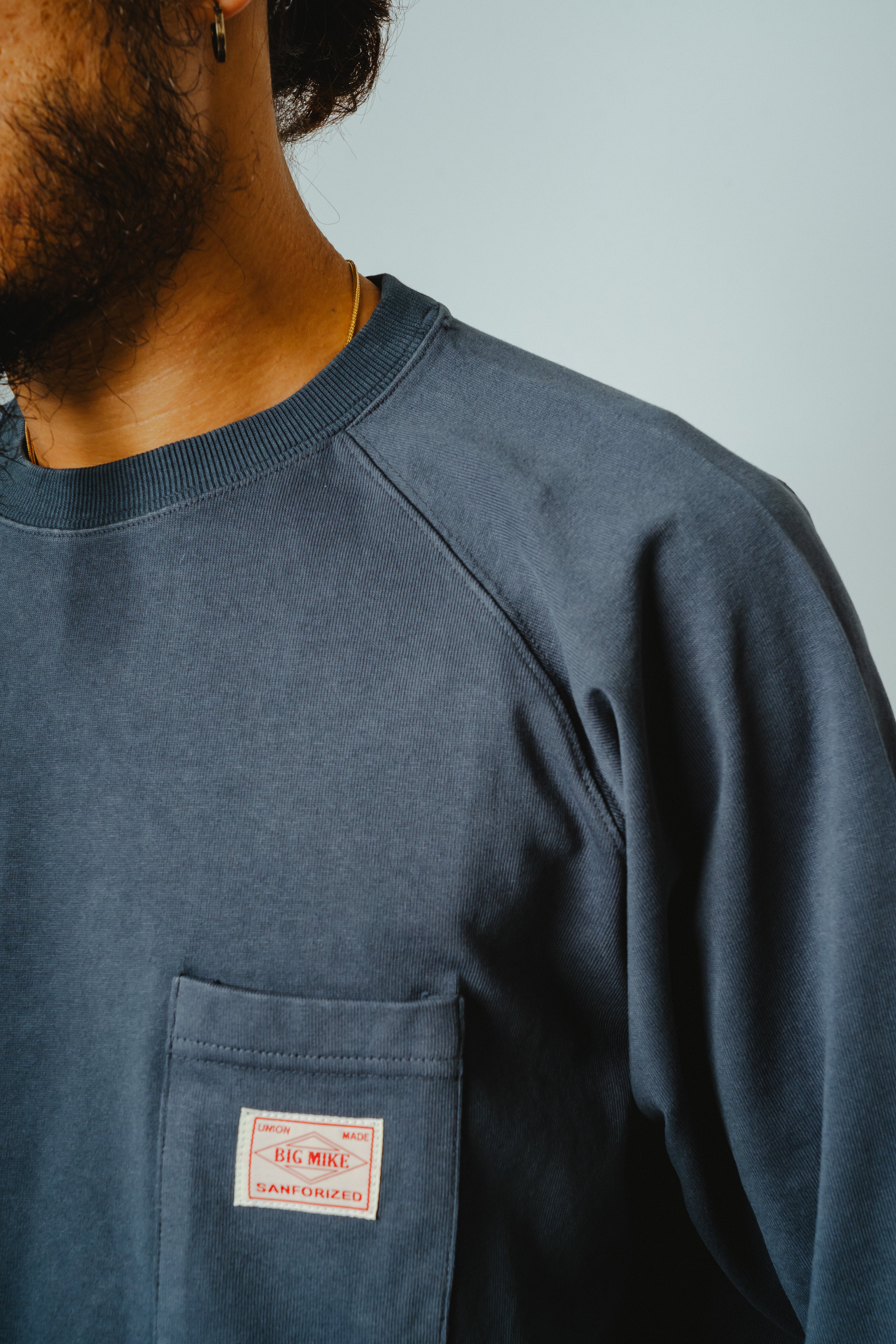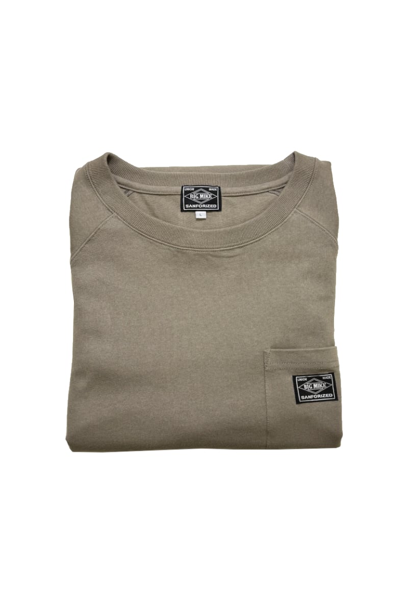 ボディには、BIGMIKEの代名詞であるヘビーウェイトコットンを採用。透けにくく、型崩れしにくい肉厚な生地感で、一枚でもしっかりと成立します。