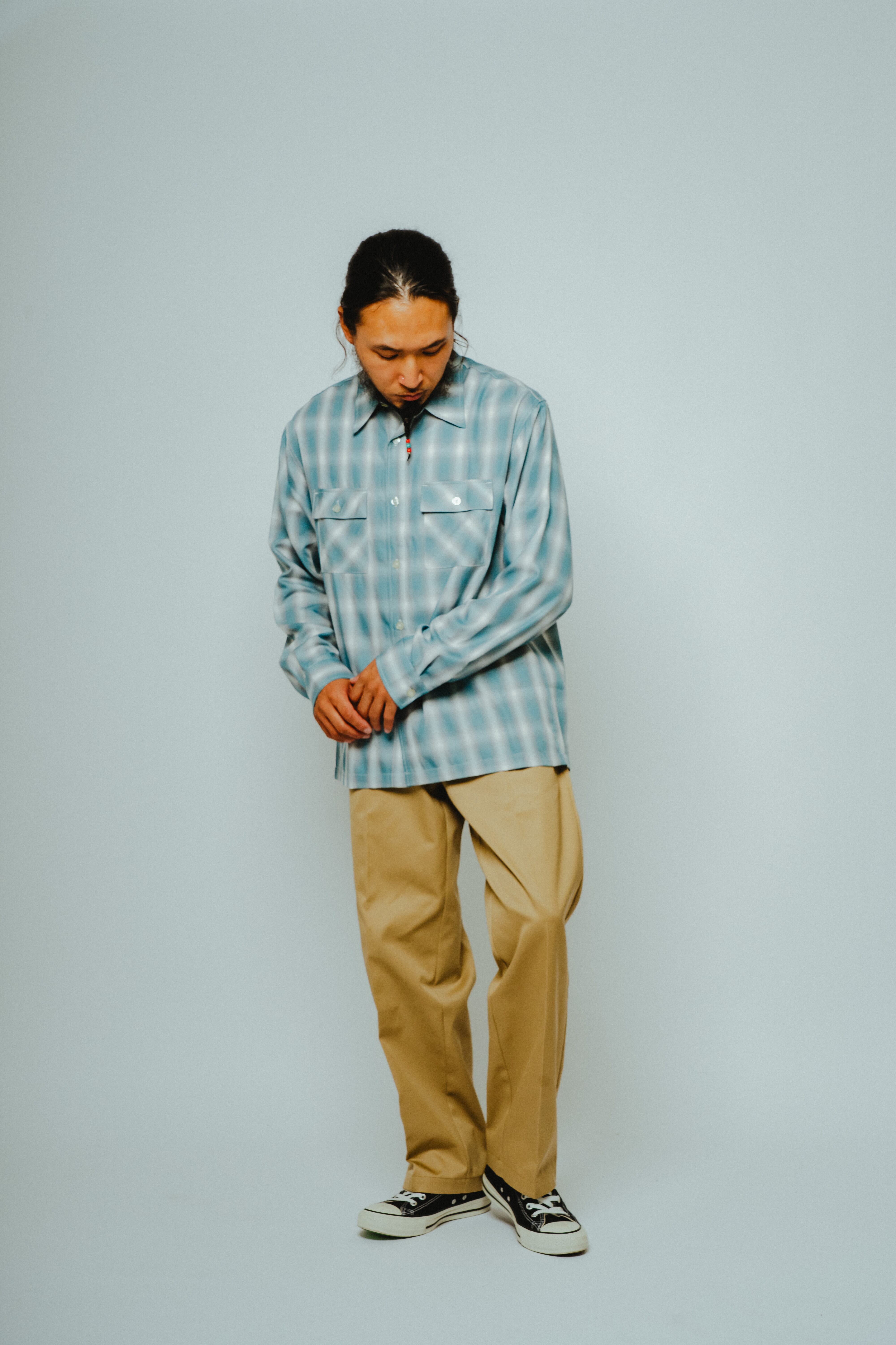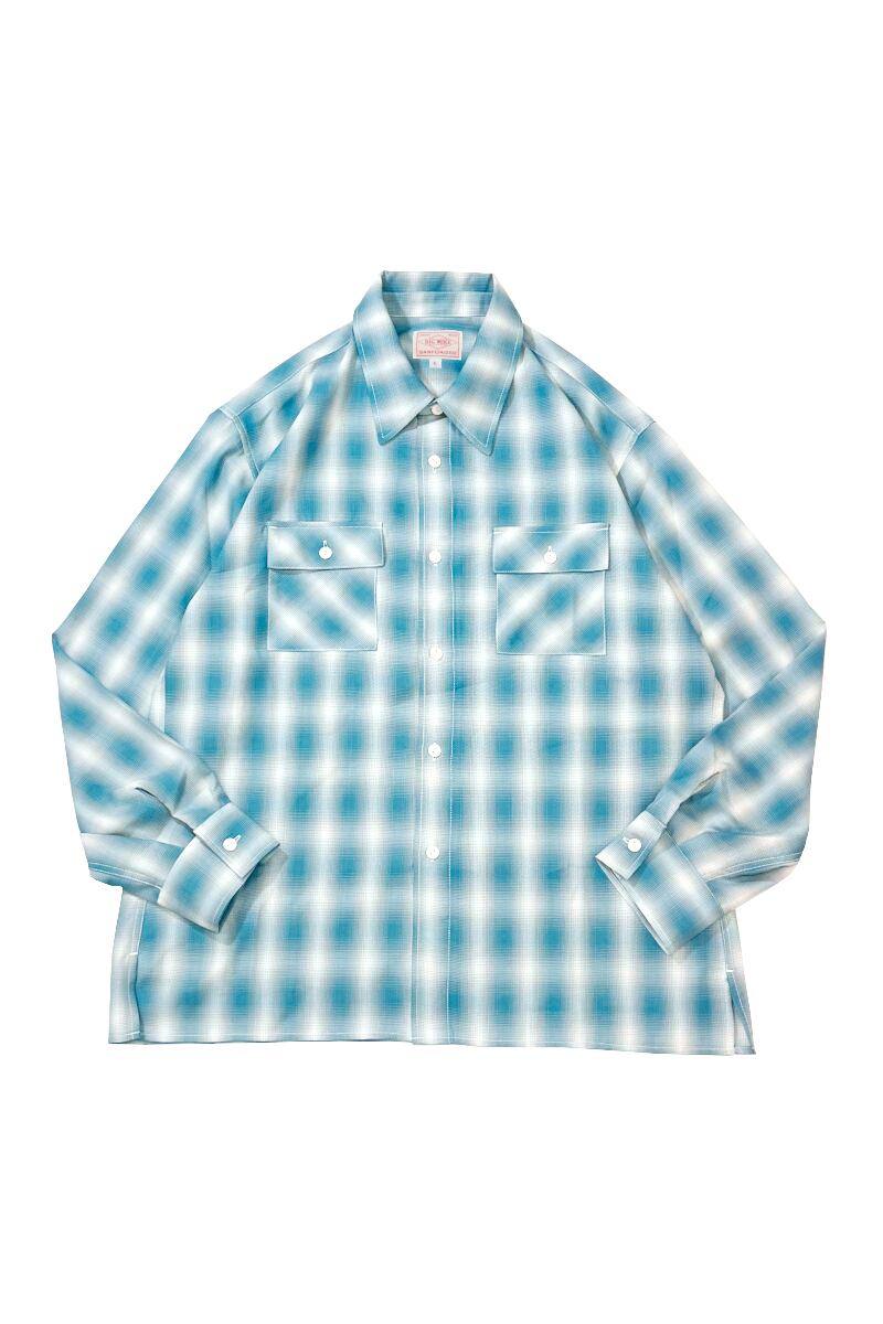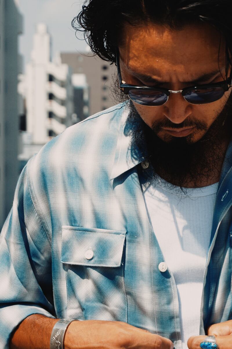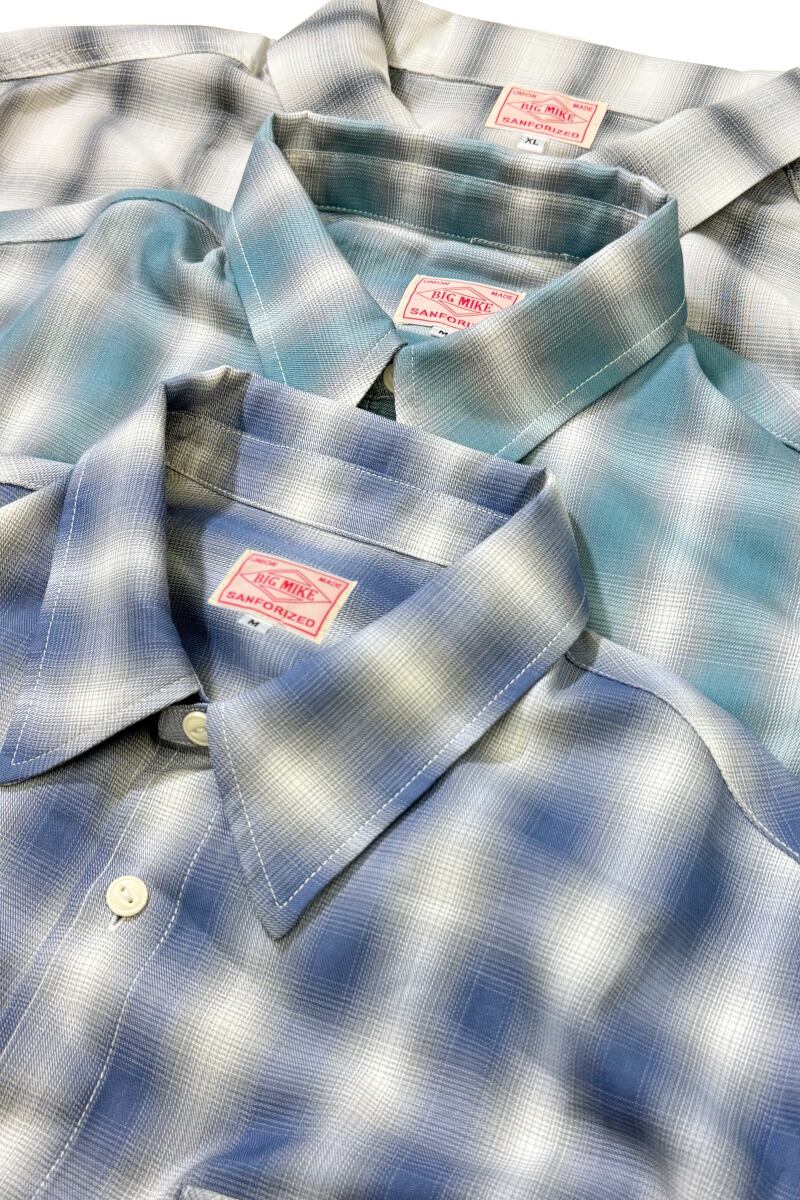 素材にはレーヨン混生地を使用。滑らかな肌触りと上品な落ち感を活かしつつ、オンブレチェックのパターンや色味は現代のスタイルに合わせてアップデートしました。BIGMIKEが得意とするヴィンテージワークシャツのエッセンスをベースに、今の気分で着られるフィットと仕様へと再構築。