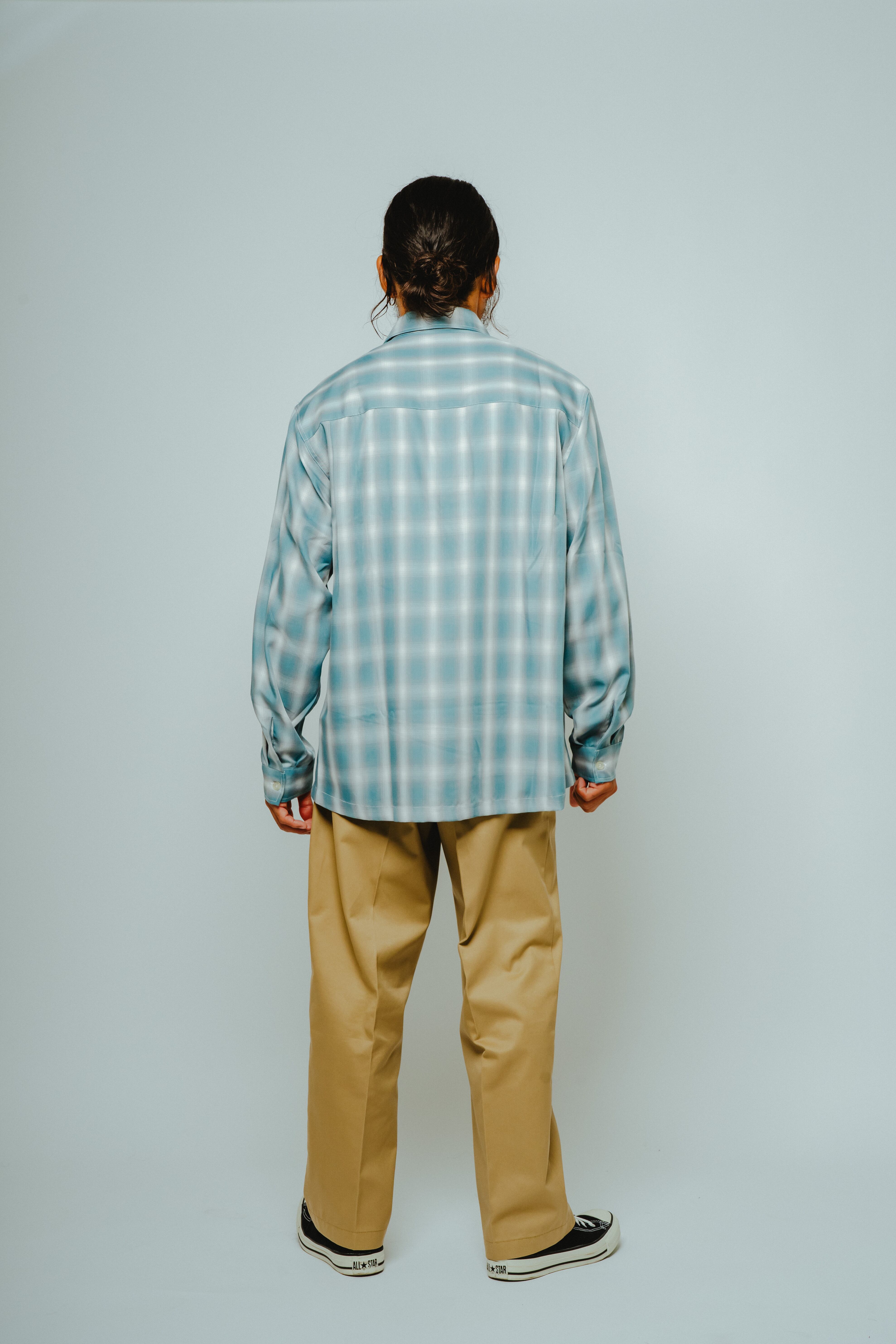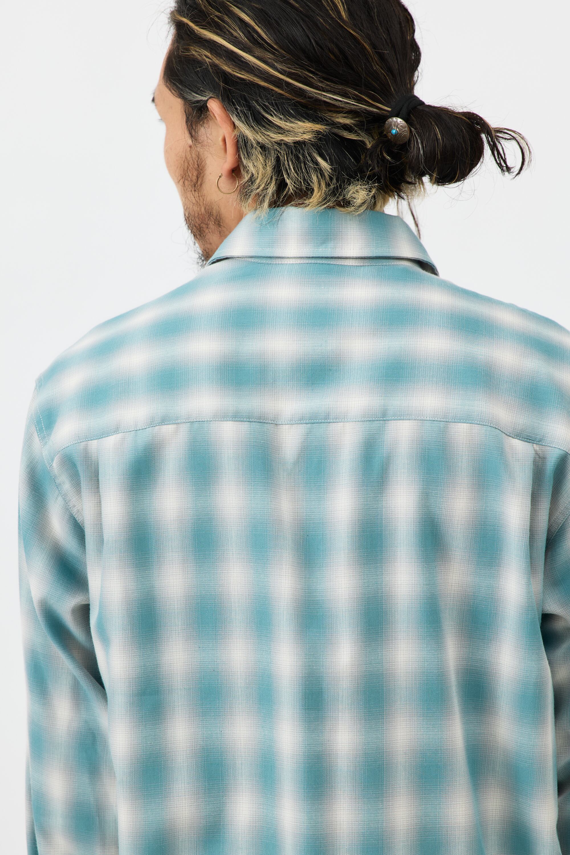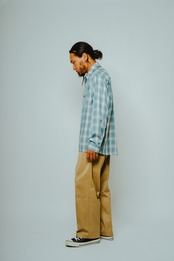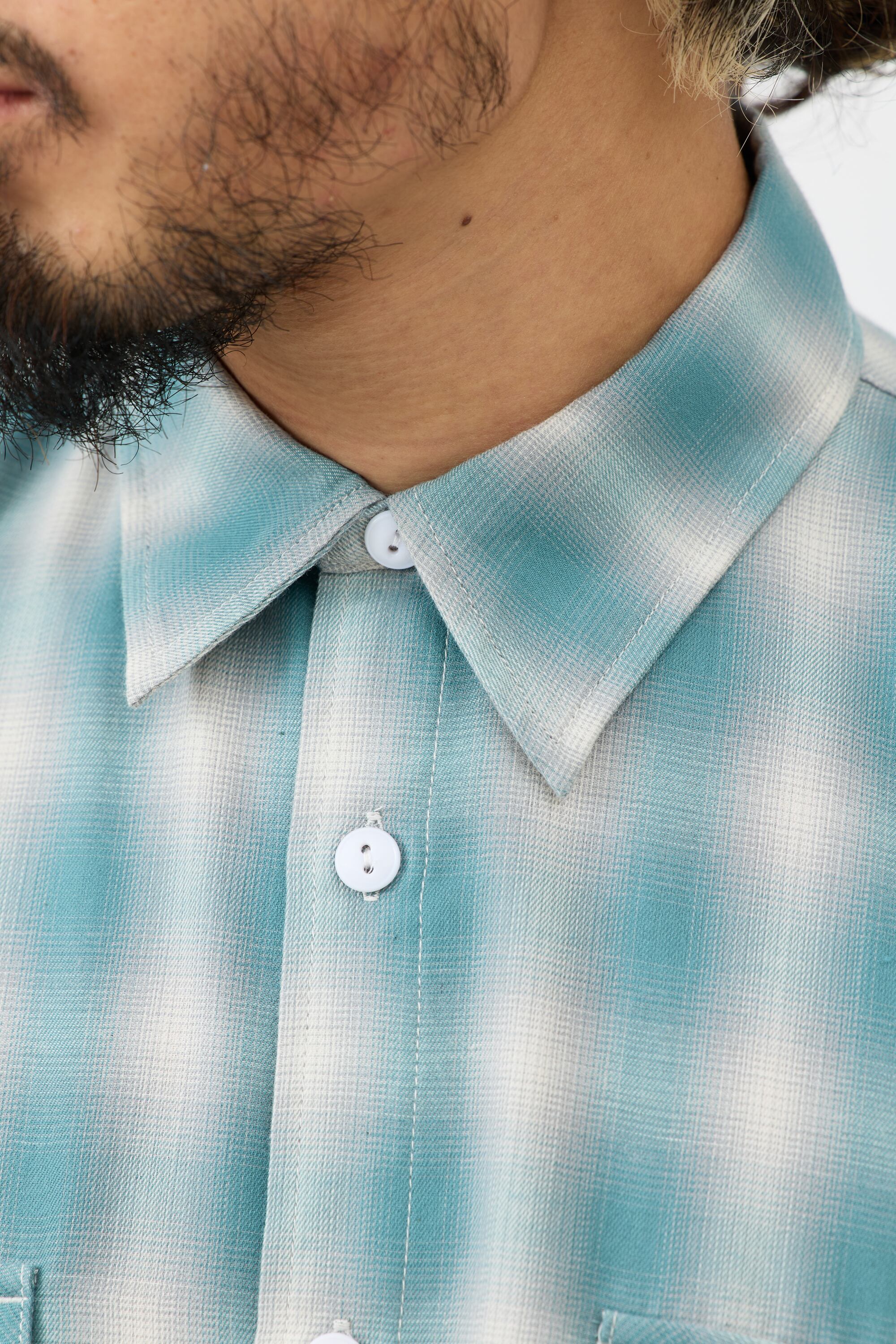 素材にはレーヨン混生地を使用。滑らかな肌触りと上品な落ち感を活かしつつ、オンブレチェックのパターンや色味は現代のスタイルに合わせてアップデートしました。BIGMIKEが得意とするヴィンテージワークシャツのエッセンスをベースに、今の気分で着られるフィットと仕様へと再構築。