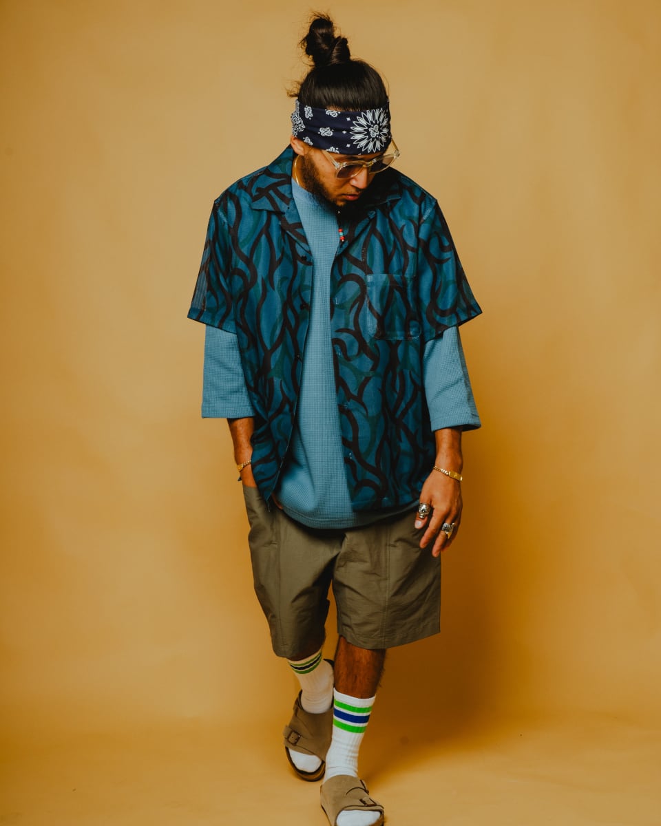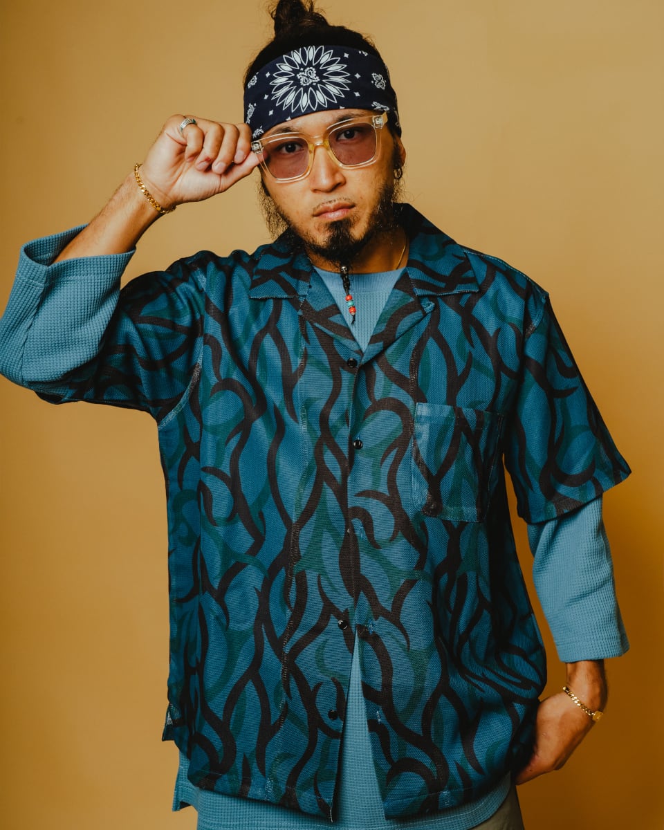 トライバルカモ柄を、総メッシュ素材で仕上げたオープンカラーシャツ。鋭利なラインで構成されたトライバルカモは、一般的な迷彩とは異なる都会的でエッジの効いた表情が特徴。90年代〜00年代のストリートカルチャーを彷彿とさせる、存在感のある一着です。
