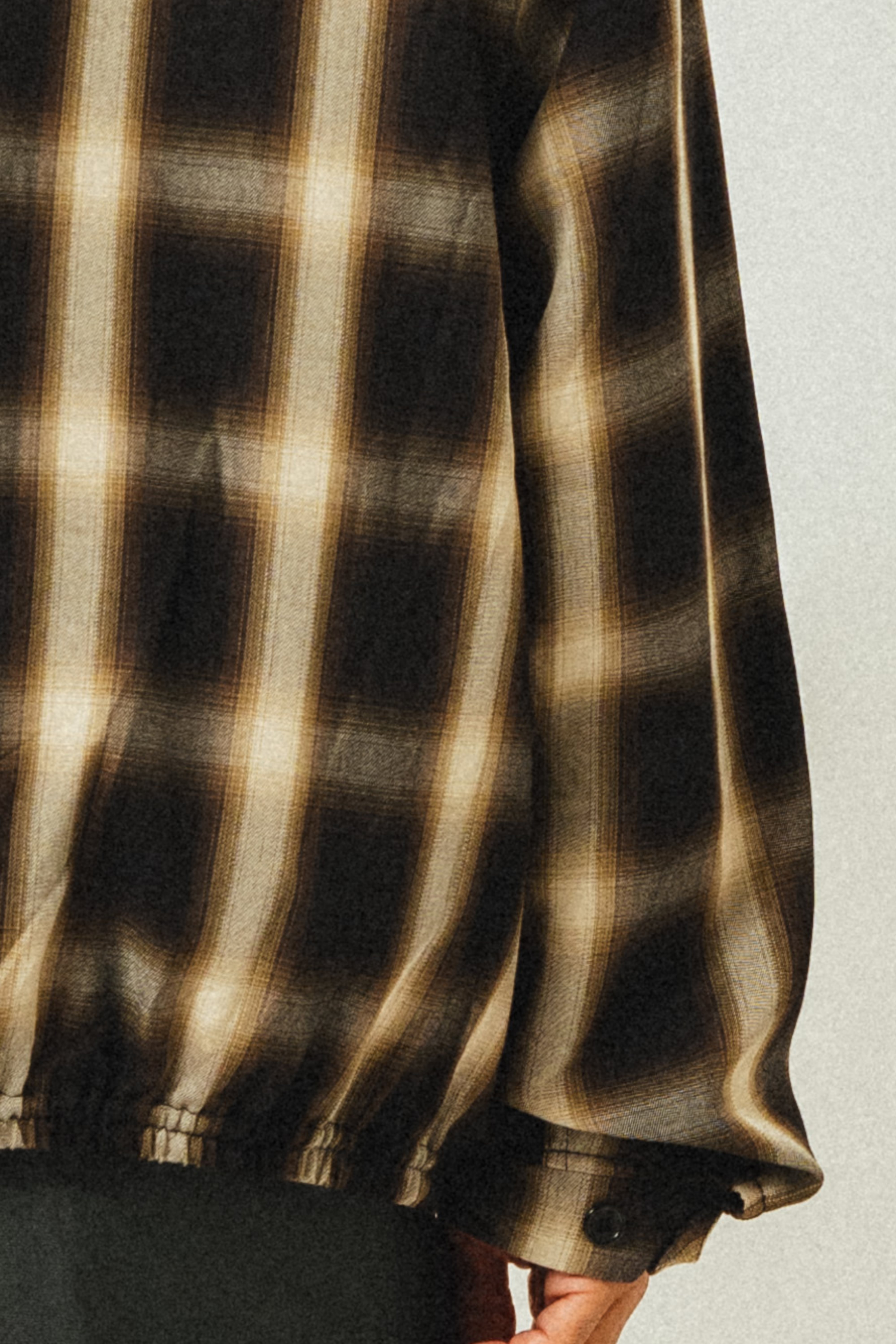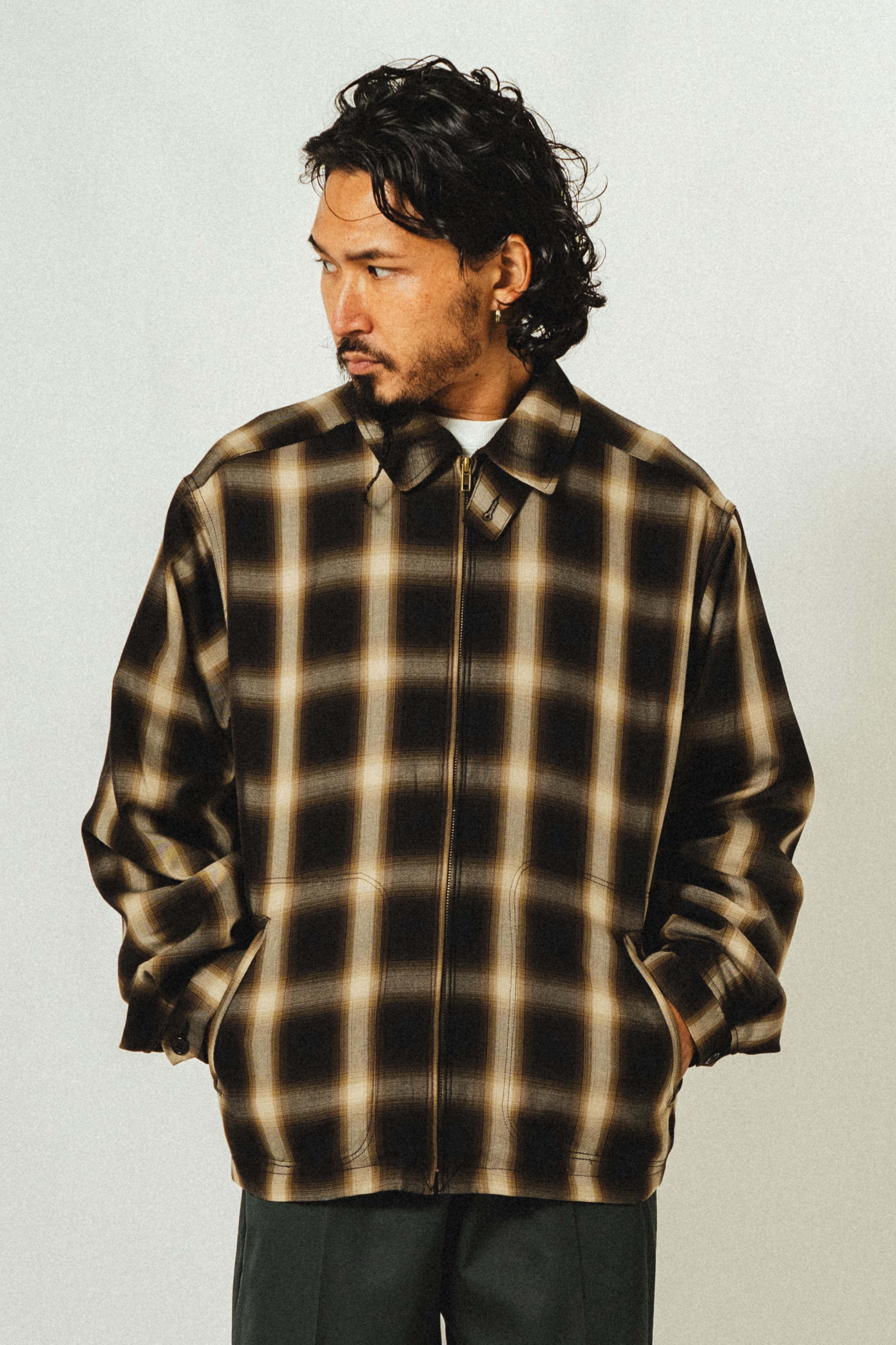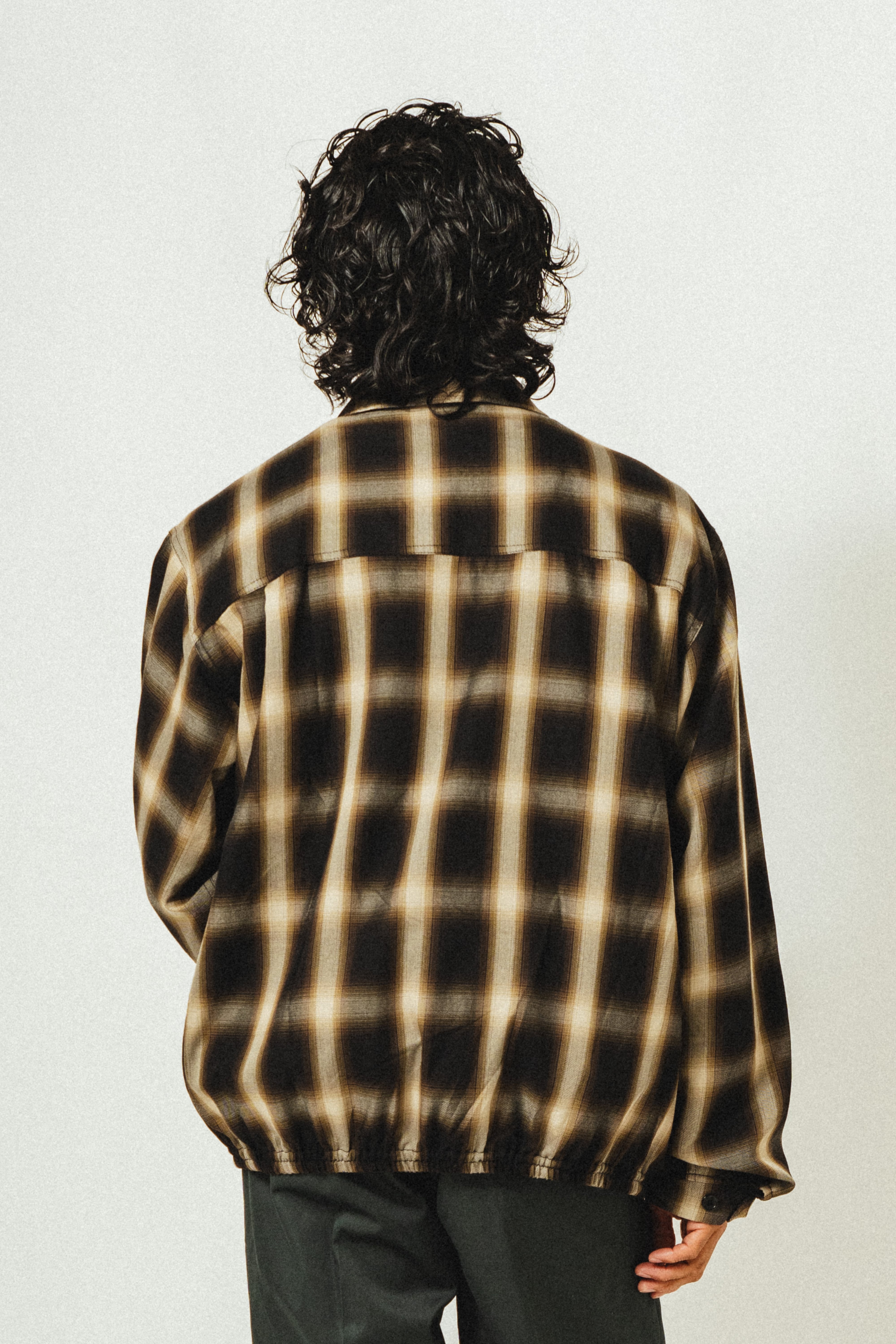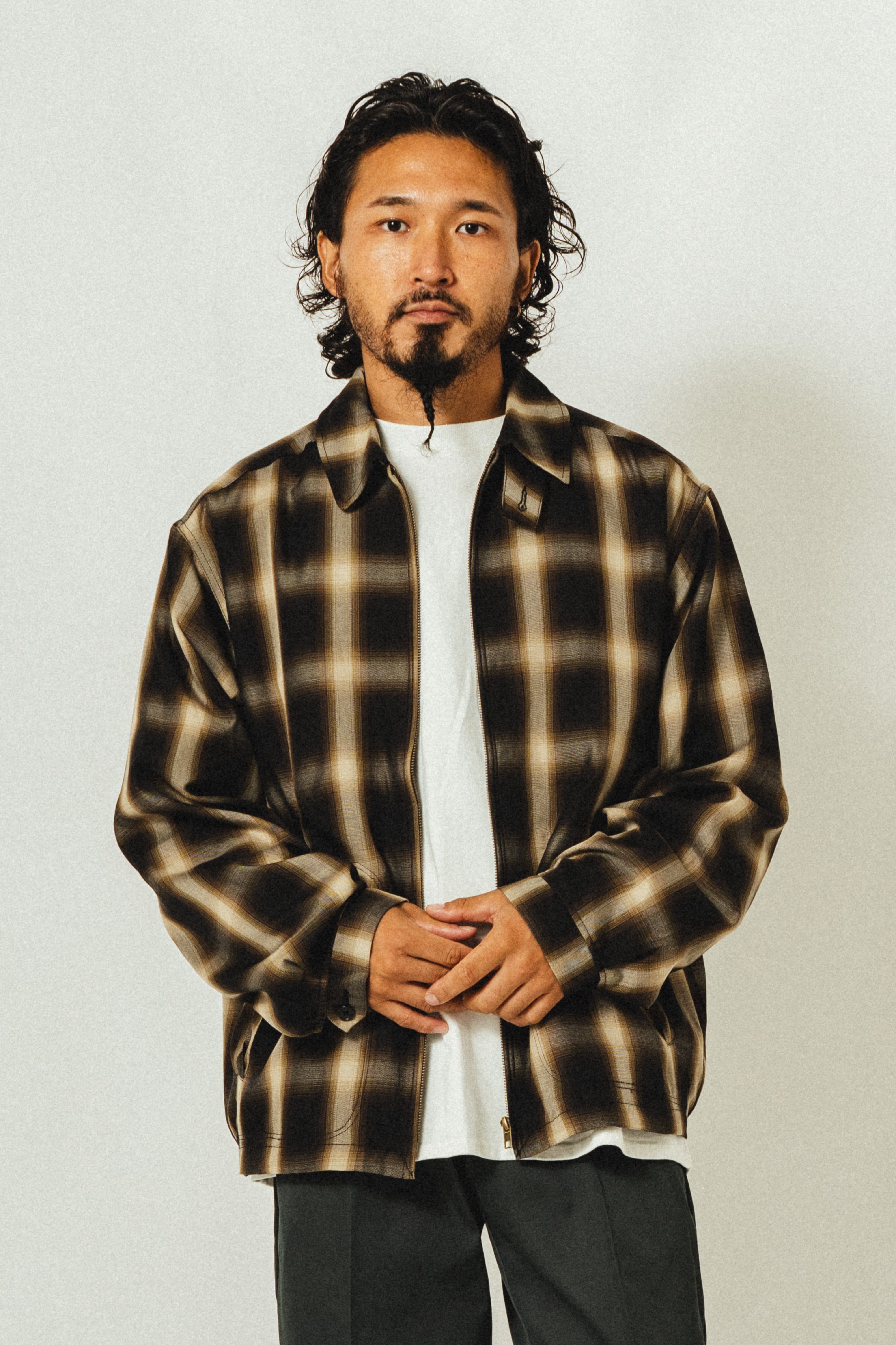 シングルファスナー、フロントにポケットが2つ付き、首元のタブ、背面の裾はゴム仕様で広がり過ぎず実用的なディテールです。オンブレシャツとは一味違うジャケットタイプ、同時展開のイージーパンツとセットアップでの着用も可能です。